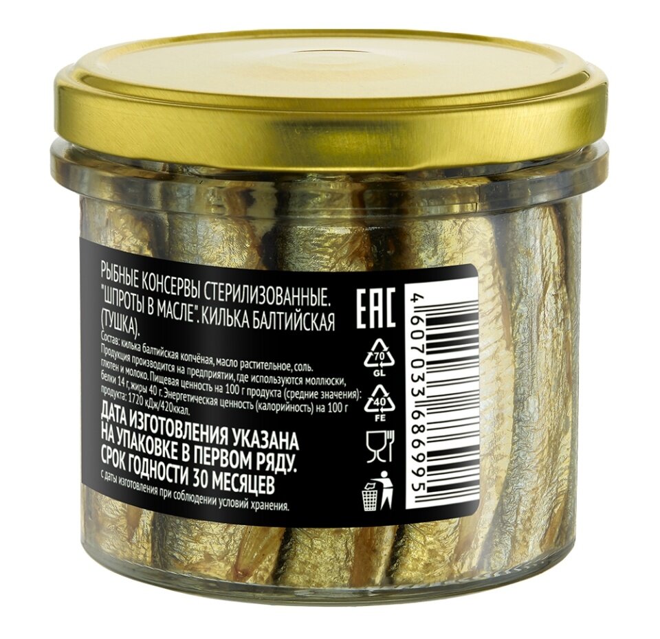 Состав: рыба (килька балтийская) копченая тушка, масло подсолнечное, соль поваренная пищевая