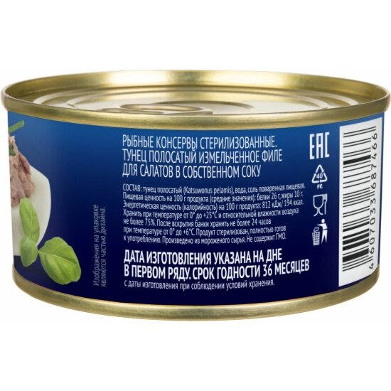 | Состав | тунец полосатый (Katsuwonus pelamis), вода, соль поваренная пищевая |