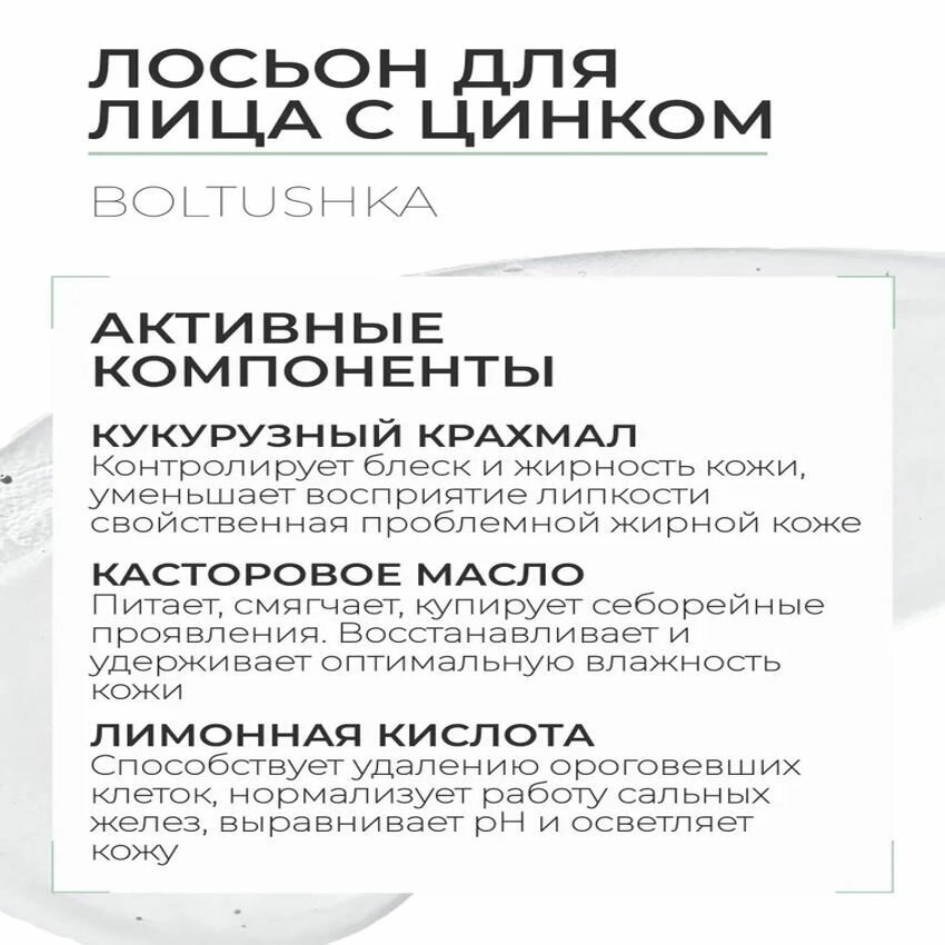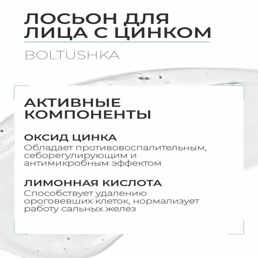 Лосьон для лица с цинком Boltushka – средство для ухода за жирной и проблемной кожей лица, склонной к появлениям акне различных форм и степени тяжести, созданное на основе активных противовоспалительных и заживляющих компонентов. Лосьон оказывает противовоспалительное и успокаивающее действия, нормализует работу сальных желез, подсушивает воспалительные элементы, а также предотвращает появление новых. Уменьшает жирный блеск, не оставляет ощущения сухости и стянутости.