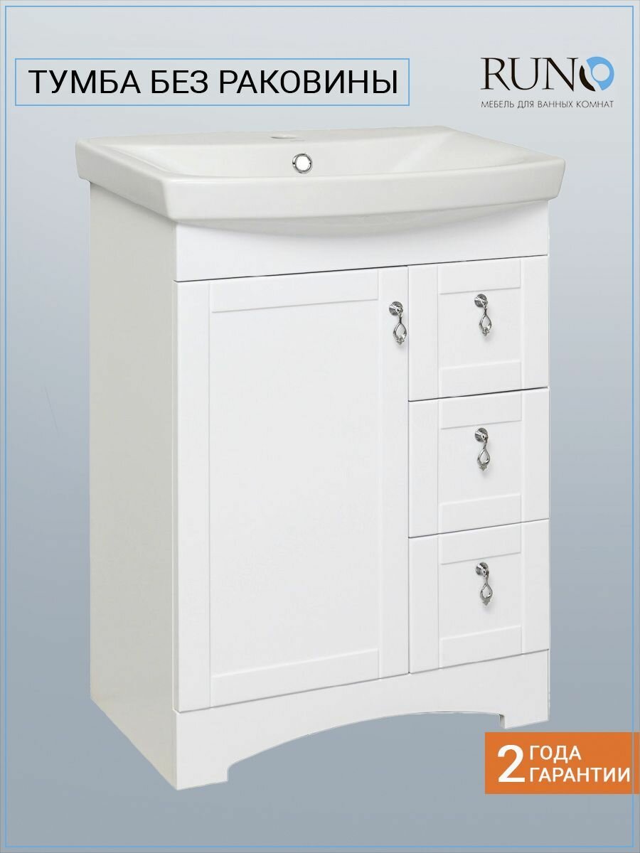 Тумба под раковину Runo Мерида 00-00000823. Коллекция мебели Мерида выполнена в классическом стиле. Четкие, лаконичные формы и продуманный функционал помогут украсить интерьер любой ванной комнаты.Тумба напольная с одним распашным фасадом и тремя выдвижными ящиками. За левой дверкой - одна внутренняя полка. Ящики - на шариковых направляющих полного выдвижения, петли со встроенным доводчиком, ручки - 4шт, ножки пластик - 4шт (скрыты за нижней фальш-панелью)