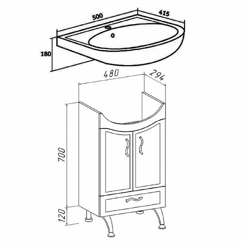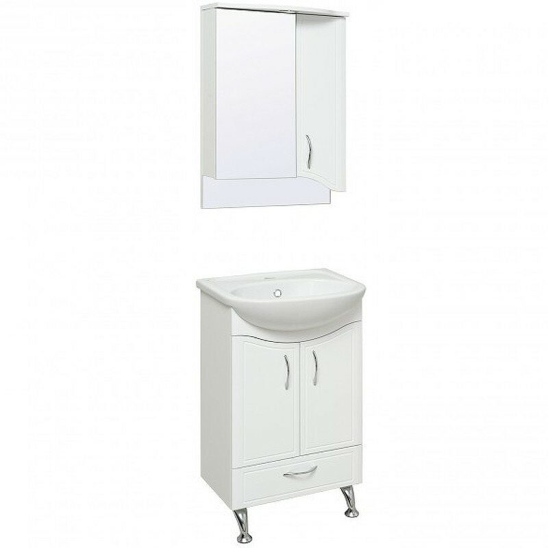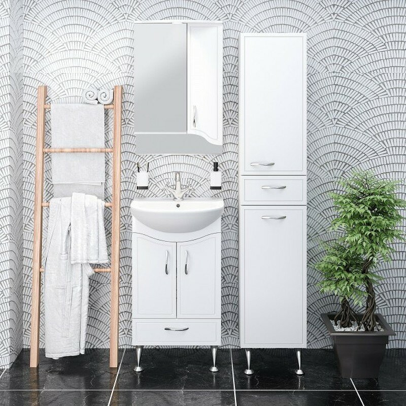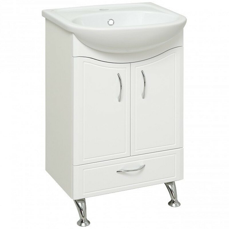 Тумба под раковину Runo Севилья 00000000792. Тумба под умывальник напольная с двумя распашными фасадами и нижним выдвижным ящиком. За фасадами - одна встроеннаяя полка. Петли со встроенным доводчиком, ящик - на шариковых направляющих, ручки - 3шт, ножки хром - 2шт, ножки пластик -2шт.