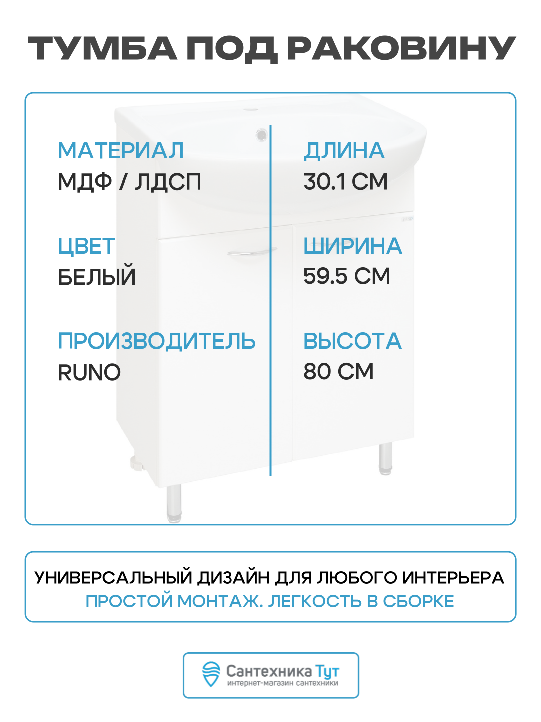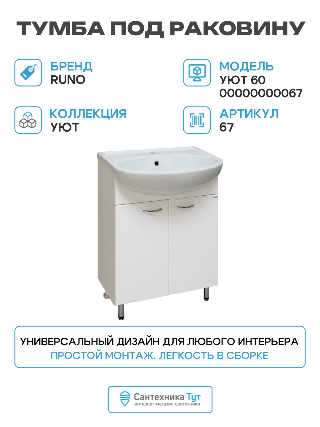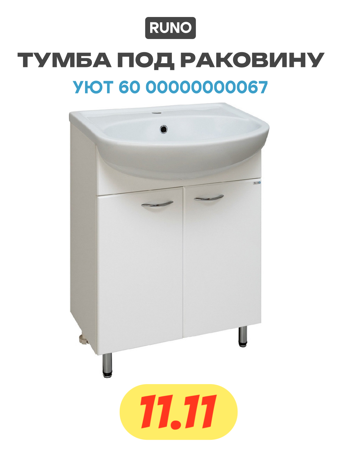 Тумба под раковину Runo Уют 00000000067. Тумба под умывальник напольная с двумя распашными фасадами и одной внутренней полкой. Петли со встроенным доводчиком, ручки - 2шт, ножки хром - 2шт, ножки пластик -2шт.