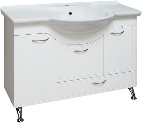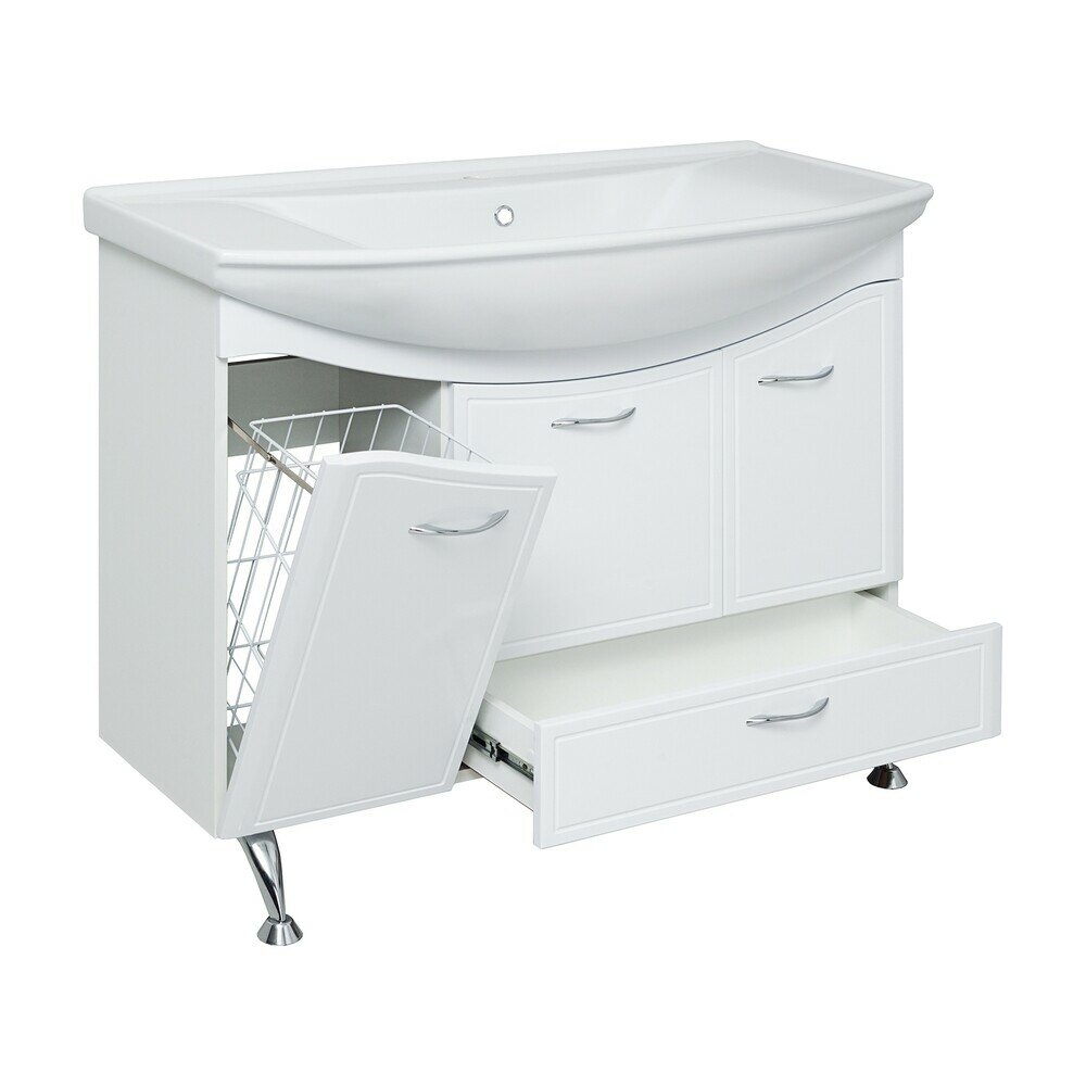 Тумба под раковину Runo Севилья 00000000598. Тумба под умывальник напольная с двумя распашными фасадами, откидной дверкой посередине и нижним выдвижным ящиком. Фасад слева откидной и укомплетован встроенной корзиной для белья. Петли со встроенным доводчиком, ящик - на шариковых направляющих полного выдвижения, ручки - 4шт, ножки хром -2шт, ножки пластик - 2шт.
