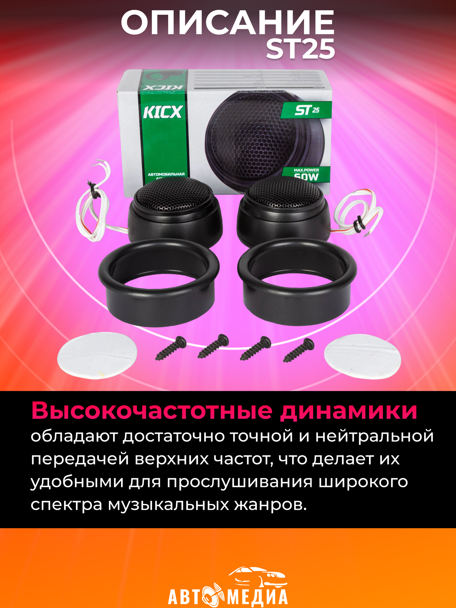 Kicx ST 25 - высокочастотный динамик. Высокочастотные динамики дюйма обеспечивают превосходное качество звука, они весьма компактны и универсальны. Обеспечивают ровную частотную характеристику, широкую дисперсию излучения и высокую тональную точность, их переходные характеристики соответствуют всем требованиям, предъявляемым к современным высокочастотным динамикам.