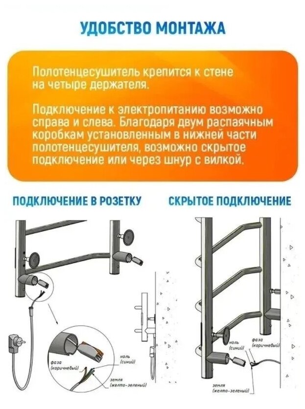 | ВКоробке | Полотенцесушитель - 1 шт. Терморегулятор - 1 шт. Комплект креплений - 1 шт. Электрический кабель - 1 шт. Инструкция - 1 шт. |
