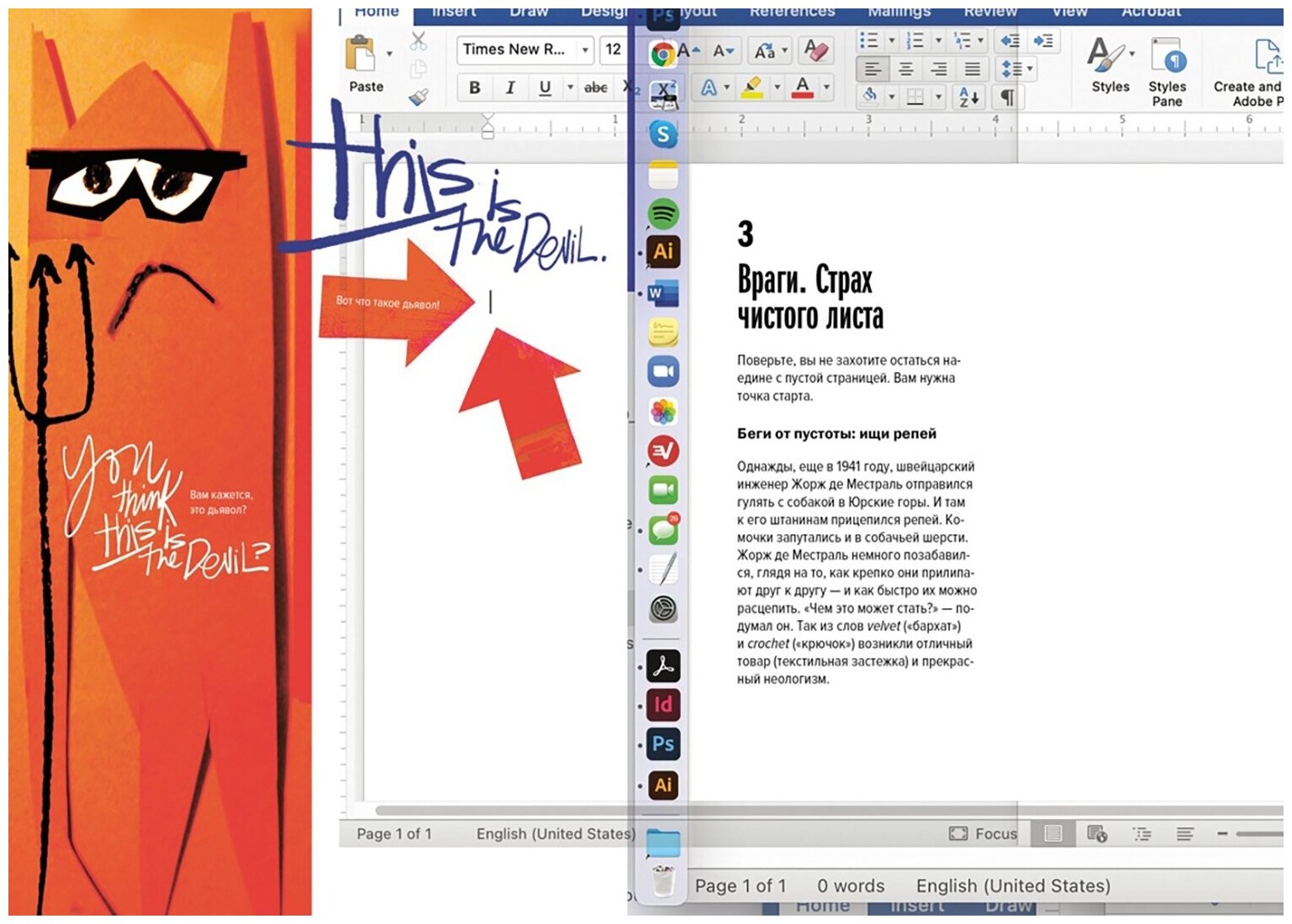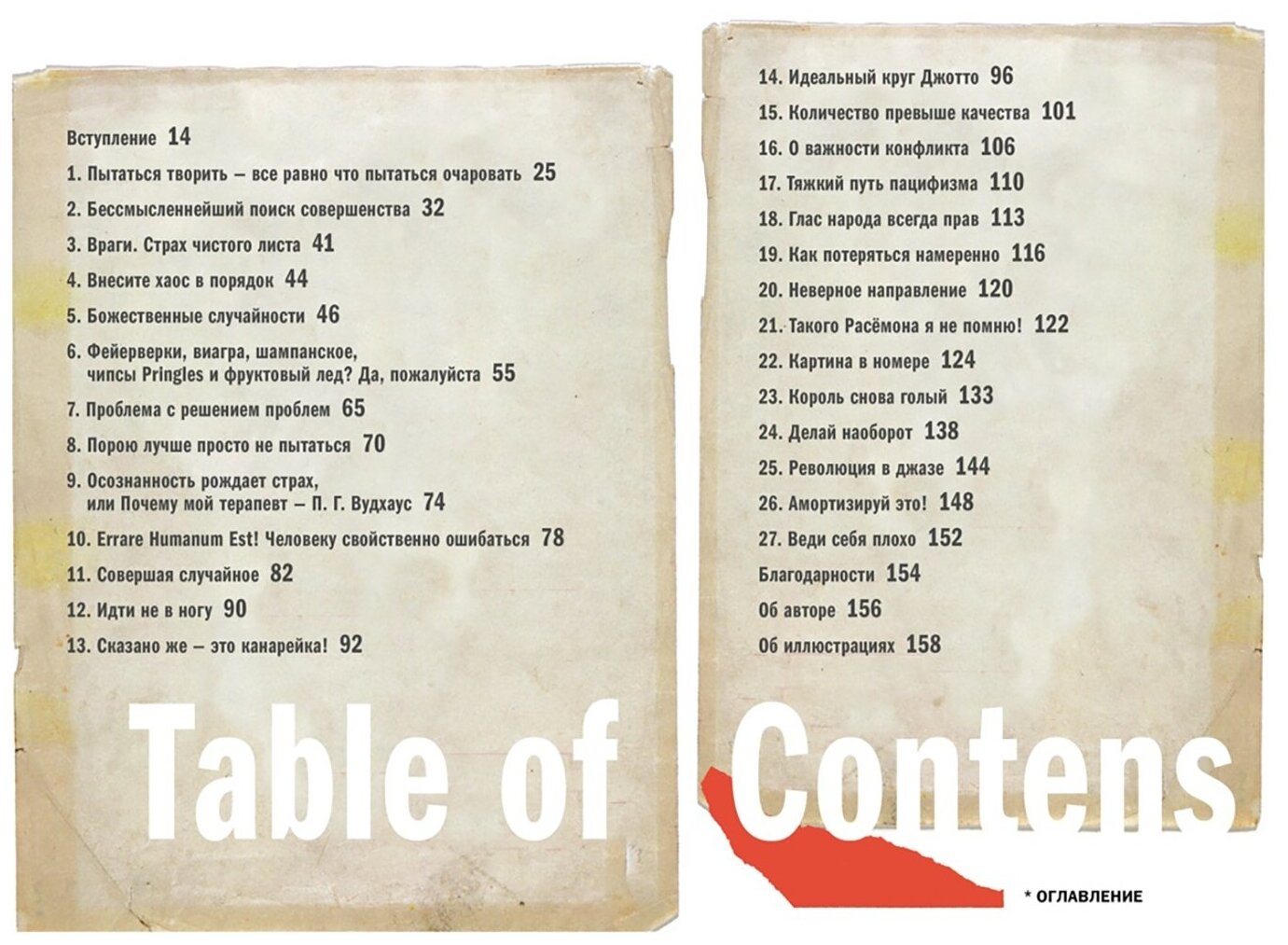 «Я говорю не о том, как принять свои промахи или научиться на них, а в следующий раз сделать лучше. Суть в том, чтобы на самом деле ошибаться намеренно. Ведь именно ошибки помогают создать нечто оригинальное — и обрести свободу, отклеиться, когда вы залипли. Сделать это можно по-разному. Истории, которые последуют, — примеры идей: добавьте случайность, предпочтите количество качеству, внесите хаос в порядок, пойдите неверным путем… Удивите себя — и вы удивите других; это бесценно в мире, в котором, кажется, уже все придумано. А еще это весело! Начнем же прямо сейчас». (Лори Розенвальд)