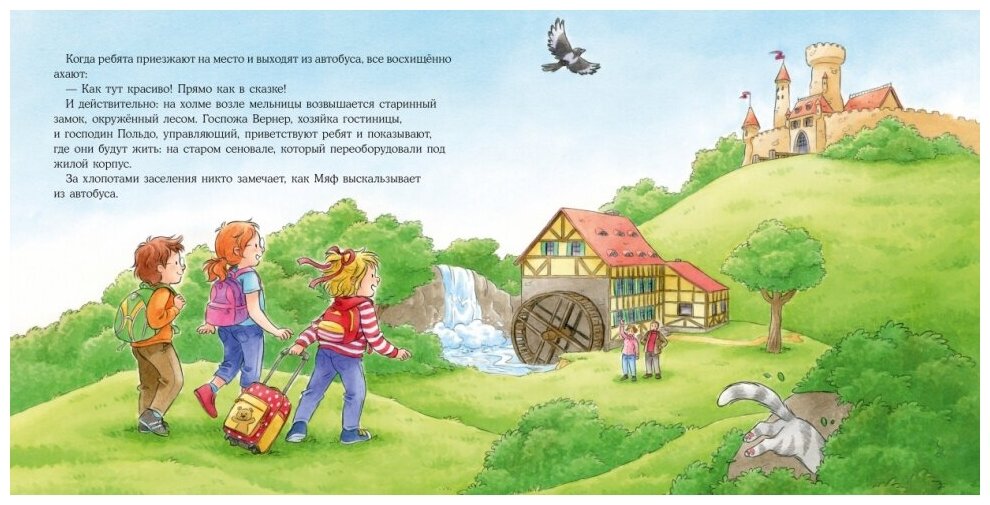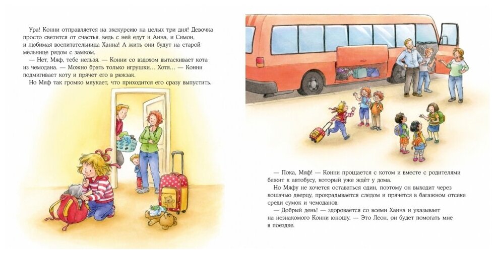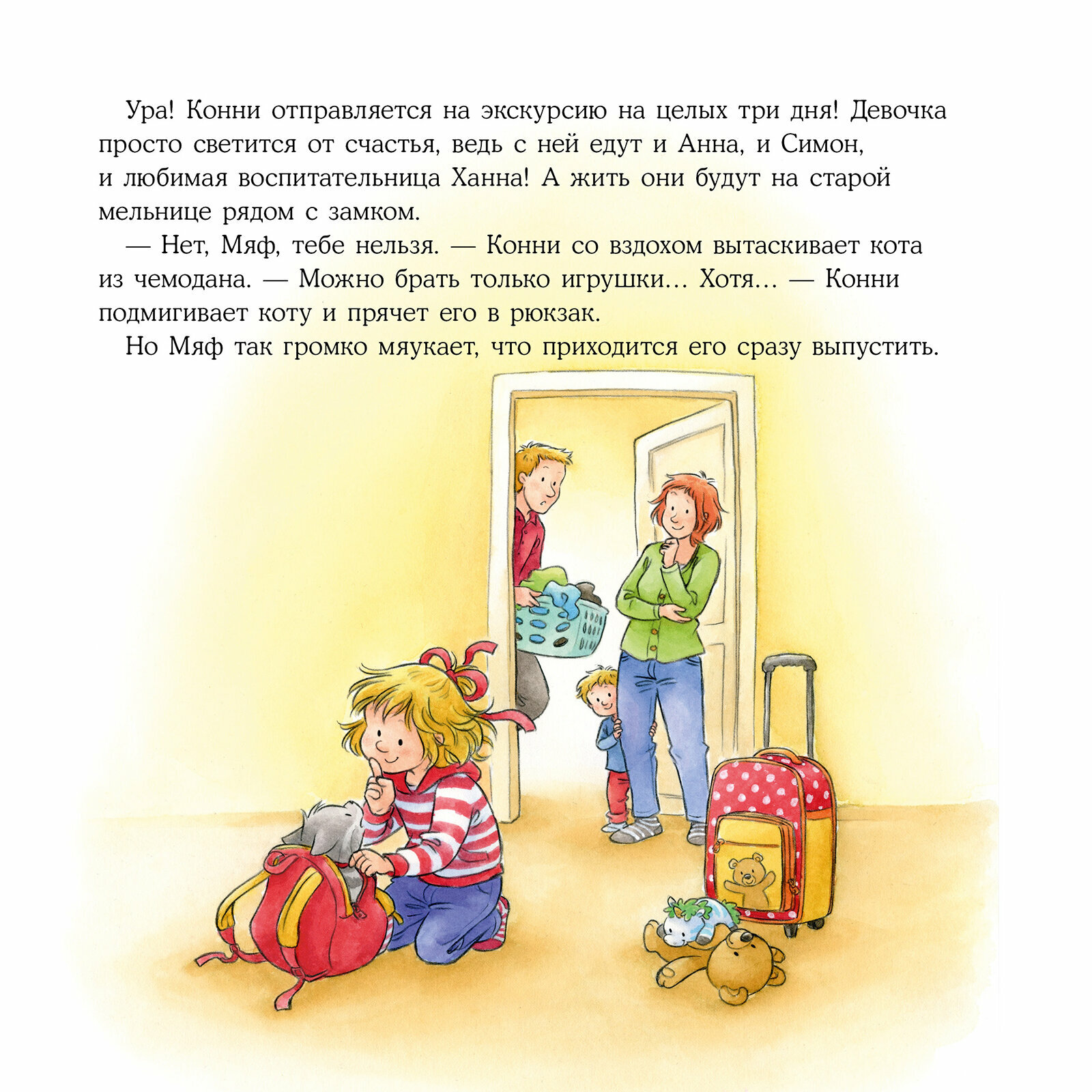 «Ура! Родители разрешили Конни поехать с детским садом на экскурсию на целых три дня! Конни просто светится от счастья, ведь с ней едут и Анна, и Симон, и любимая воспитательница Ханна! А жить они будут на старой мельнице рядом со красивым замком.