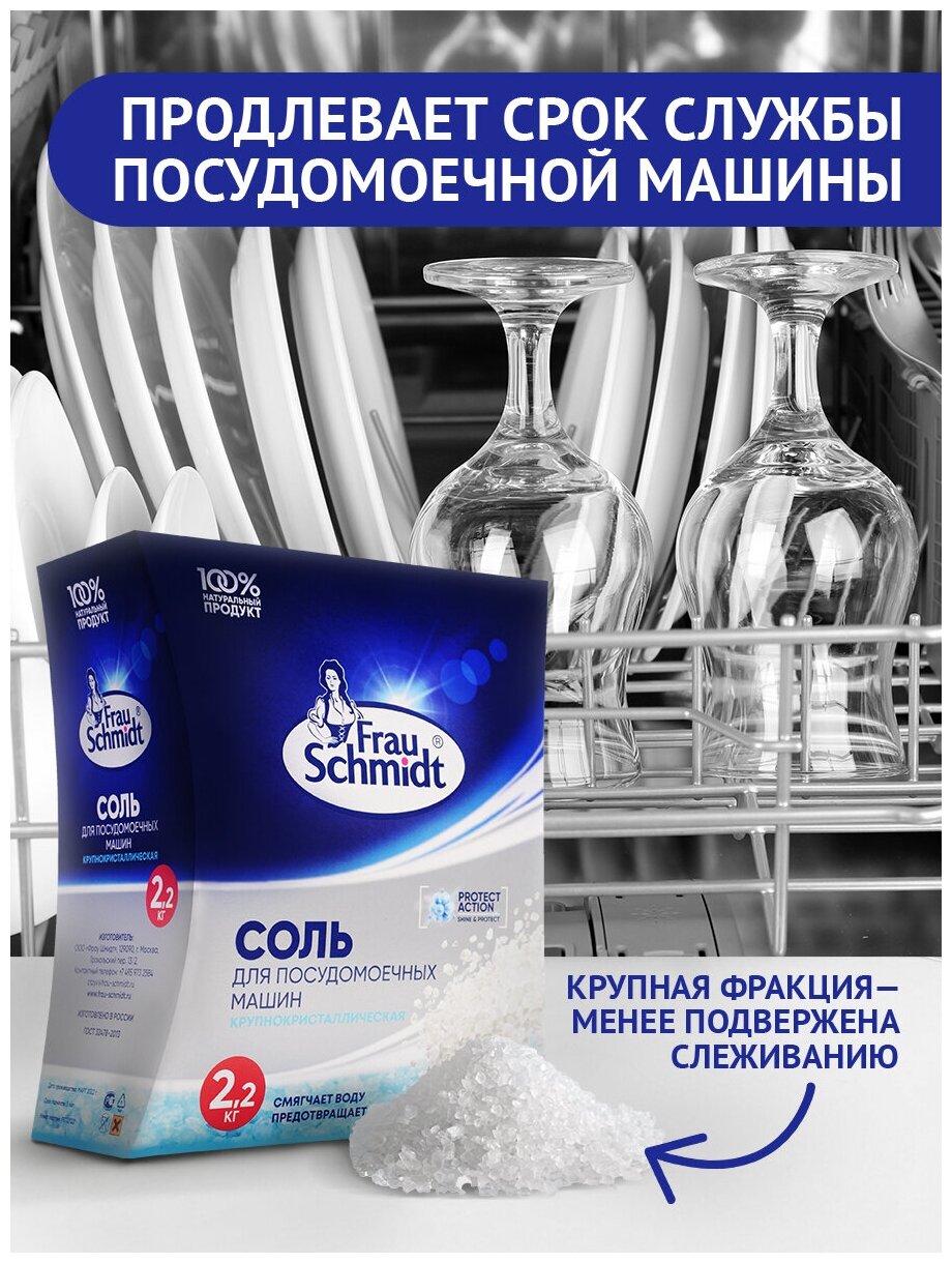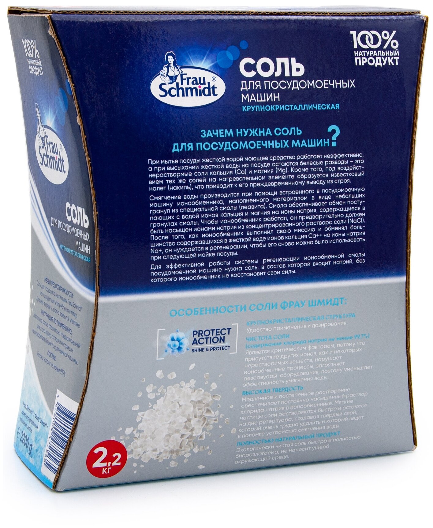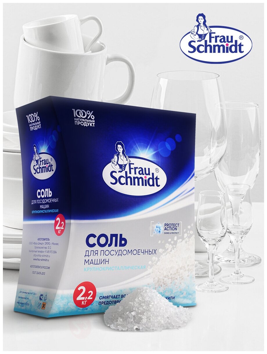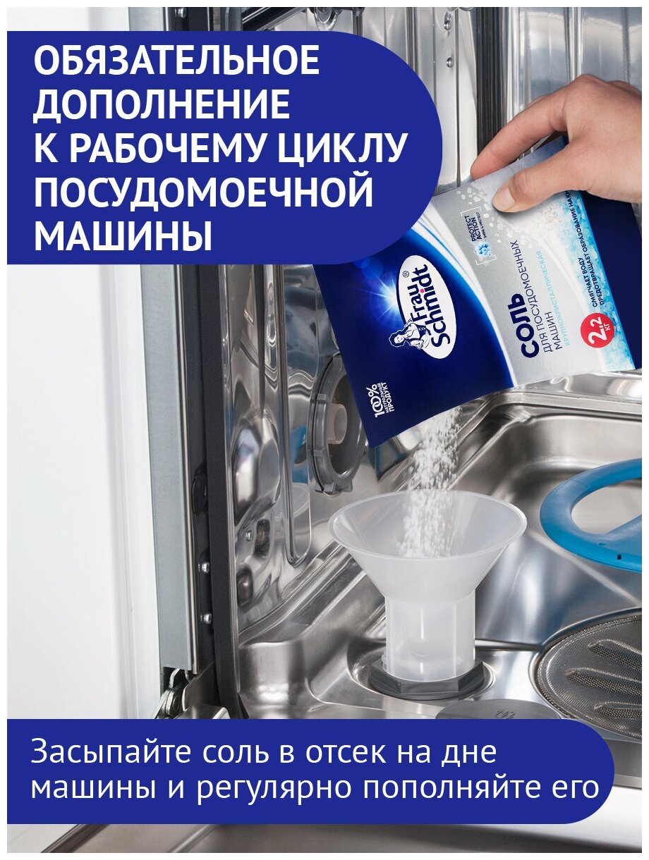 Чтобы посудомоечная машина служила вам долгие годы и радовала чистой сияющей посудой, не забывайте использовать специальную крупнокристаллическую соль для посудомоечных машин FRAU SCHMIDT.Соль FRAU SCHMIDT– необходимое дополнение к рабочему циклу посудомоечной машины, важнейшее средство защиты нагревательных элементов машины от известкового налета. Соль FRAU SCHMIDT продлевает срок службы ионообменника посудомоечной машины, смягчает жесткую воду. В результате, вы избегаете дорогостоящего ремонта или покупки новой техники. Кроме того, соль FRAU SCHMIDT защищает вашу посудомоечную машину от образования плесени и появления неприятного запаха.Благодаря регулярной добавке соли FRAU SCHMIDT ваша посуда будет идеально чистотой - без пятен, разводов и подтеков. Крупная фракция позволяет соли не слеживаться и не рассыпаться. Соль FRAU SCHMIDT – это 100% натуральный продукт высшей степени очистки без дополнительных добавок и примесей.Засыпьте необходимое количество крупнокристаллической соли FRAU SCHMIDT в специальный отсек на дне машины и пополняйте ее по мере использования.