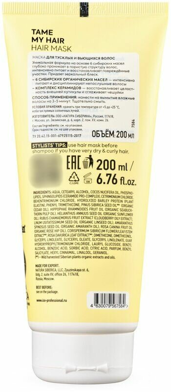 | Состав | Aqua, Cetearyl Alcohol, Cocos Nucifera Oil, Phospholipids, Sphingolipids (Ceramide Complex), Cetrimonium Chloride, Behentrimonium Chloride, Hydrolyzed Barley Protein (Plant Elastin), Phenyl Trimethicone, Pinus Sibirica Seed Oilwh (Organic Cedar Oil), Hippophae Rhamnoides Fruit Oil (Organic Seabuckthorn Pulp Oil), Helianthus Annuus Seed Oil (Organic Sunflower Oil), Rubus Chamaemorus Fruit Extract (Cloudberry Oily Extract), Linum Usitatissimum Seed Oil (Organic Linseed Oil), Amaranthus Spinosus Seed Oil (Organic Amaranth Oil), Rosa Canina Fruit Oil (Organic Rose Hip Oil), Corispermum Sibiricum Flower/Leaf/Stem Extract Wh, Rosa Davurica Leaf Extract Wh, Dimethicone, Dimethiconol, Glyceryl Linoleate, Glyceryl Oleate, Glyceryl Linolenate, Guar Hydroxypropyltrimonium Chloride, Lauryl Glucoside, Benzyl Alcohol, Benzoic Acid, Sorbic Acid, Citric Acid, Parfum, Benzyl Salicylate, Hexyl Cinnamal, Linalool, Geraniol |