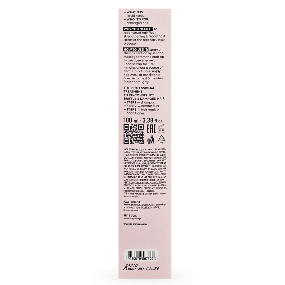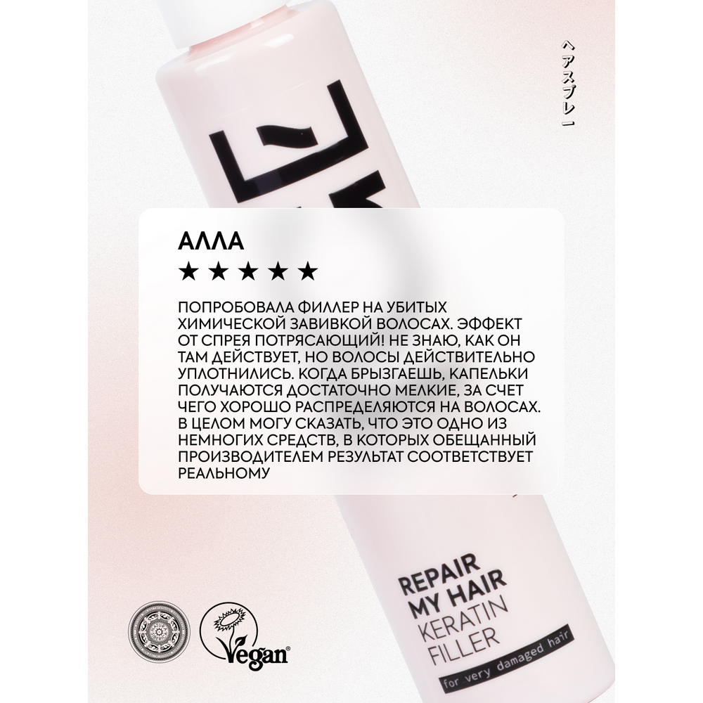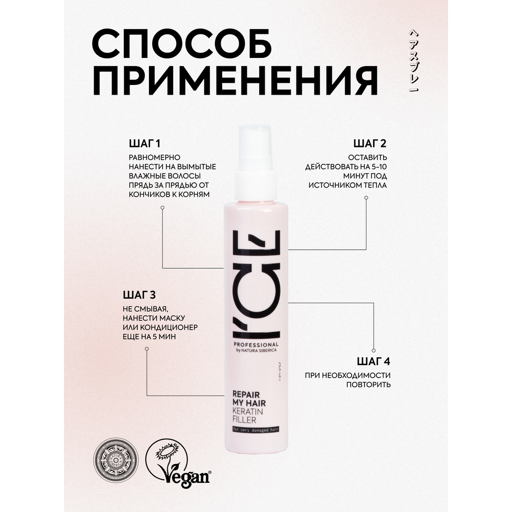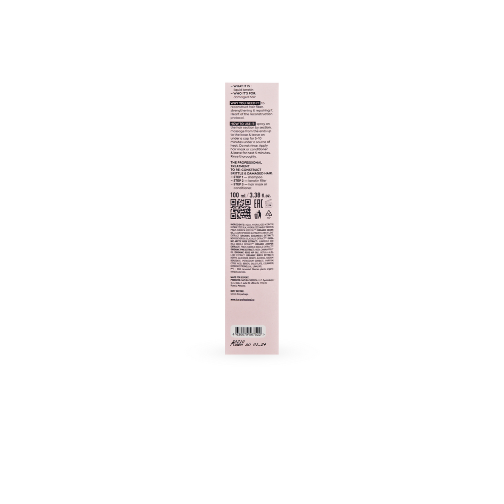 Растительный кератин заполняет повреждённые участки структуры волос и восстанавливает их. Придаёт волосам плотность и густоту, укрепляет кончики и устраняет их сечение.