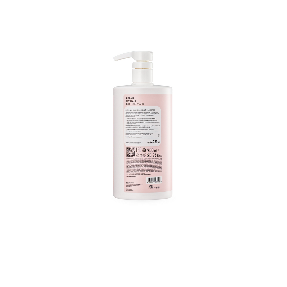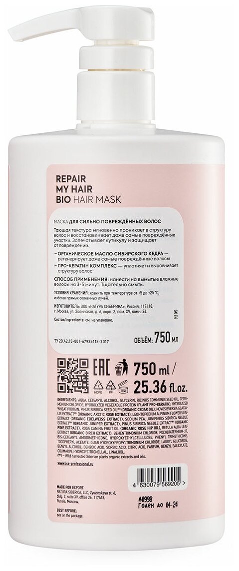 Состав: aqua, cetearyl alcohol, glycerin, ricinus communis seed oil, cetrimonium chloride, hydrolyzed vegetable protein (plant keratin), hydrolyzed wheat protein, pinus sibirica seed oilwh (organic cedar oil), novosieversia glacialis extract wh (organic arctic rose extract), leontopodium alpinum flower/leaf extract (organic edelweiss extract), sodium pca, juniperus sibirica needle extract wh (organic juniper extract), pinus sibirica needle extract wh (organic pine extract), rosa canina fruit oil (organic rose hip oil), betula alba leaf extract (organic birch extract), behentrimonium chloride, polyquaternium- 37, bis-cetearyl amodimethicone, hydroxyethylcellulose, phenyl trimethicone, tocopheryl acetate, guar hydroxypropyltrimonium chloride, lauryl glucoside, benzyl alcohol, benzoic acid, sorbic acid, citric acid, parfum, benzyl salicylate, coumarin, hydroxycitronellal, linalool