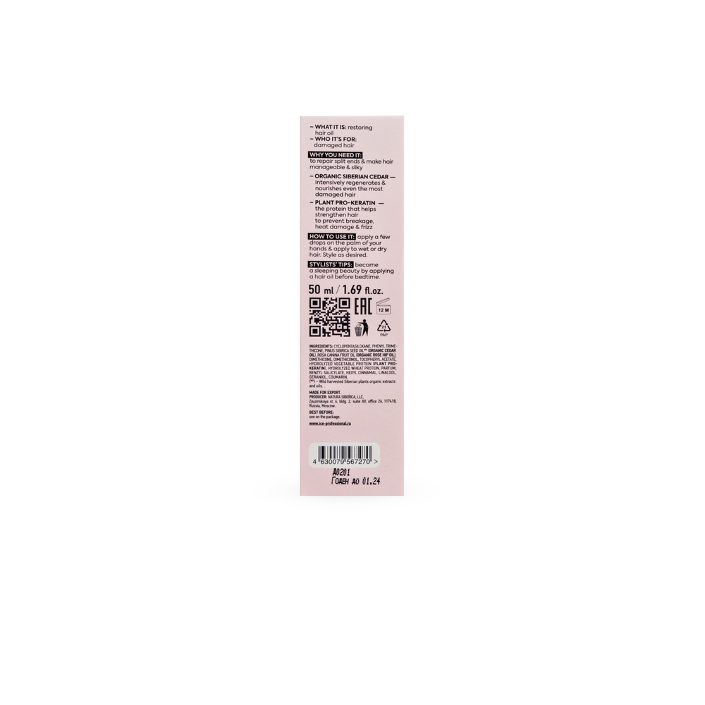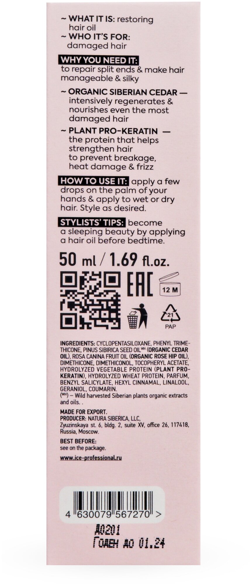 - Органическое масло сибирского кедра – регенерирует повреждённые волосы, укрепляет кутикулу и делает ее более блестящей