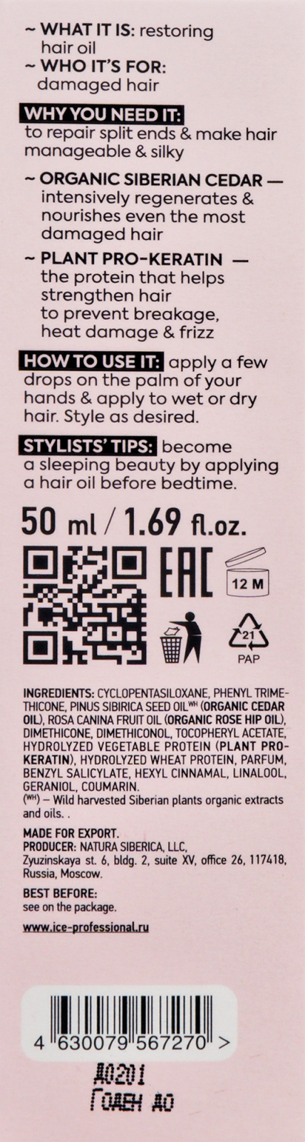 | Состав | cyclopentasiloxane, phenyl trimethicone, pinus sibirica seed oilwh (organic cedar oil), rosa canina fruit oil (organic rose hip oil), dimethicone, dimethiconol, tocopheryl acetate, hydrolyzed vegetable protein (plant keratin), hydrolyzed wheat protein, parfum, benzyl salicylate, hexyl cinnamal, linalool, geraniol, coumarin. (wh) - wild harvested siberian plants organic extracts |