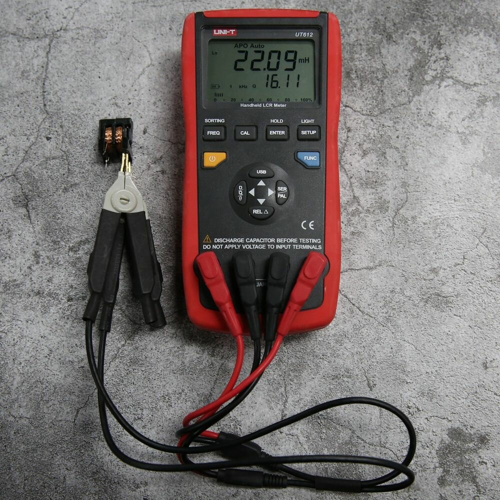 Мостовой RLC-измеритель UT612 предназначен для измерения индуктивности, емкости, сопротивления. Также прибор измеряет добротность, тангенс угла потерь, угол сдвига фаз, комплексное сопротивление (импеданс). эквивалентное последовательное (ESR) и параллельное (EPR) сопротивление компонентов.