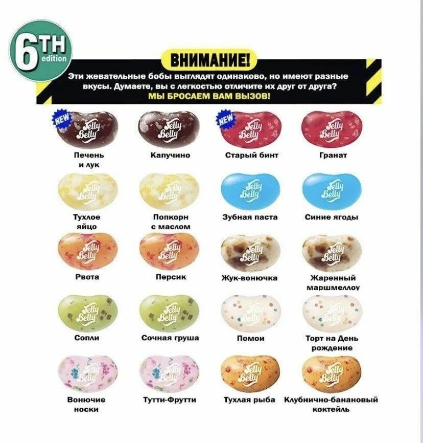 Жевательные бобы, которые смогут развеселить любую компанию. Вся суть развлечения заключается в поедании этого драже, но делать это нужно с осторожностью, т.к. помимо вкусного лакомства, вам также могут попасться "вкусняшки" со вкусом ушной серы, тухлого яйца или того хуже... Определить их по цвету не получится, даже не надейтесь. Пусть удача будет на вашей стороне!