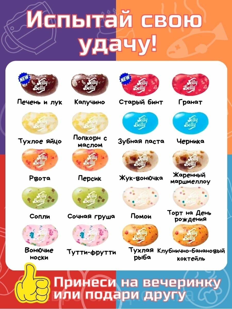 Жевательные бобы, которые смогут развеселить любую компанию. Вся суть развлечения заключается в поедании этого драже, но делать это нужно с осторожностью, т.к. помимо вкусного лакомства, вам также могут попасться "вкусняшки" со вкусом ушной серы, тухлого яйца или того хуже... Определить их по цвету не получится, даже не надейтесь. Пусть удача будет на вашей стороне!