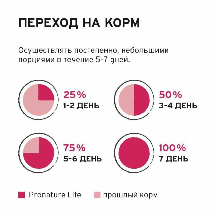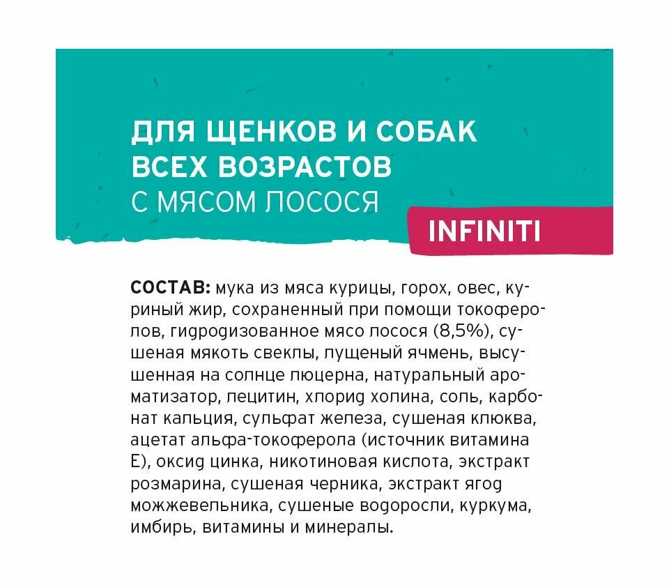 Pronature Life Infiniti – полнорационный сбалансированный сухой корм супер-премиум класса, специально разработанный для поддержания иммунитета собак всех пород и возрастов.Преимущества корма: с мясом лосося без костей; 63% белок животного происхождения; богатая антиоксидантами формула; ягоды и травы в составе; без кукурузы, сои и пшеницы.Корм разработан в Канаде и подходит для собак всех пород и возрастов. Состав: мука из мяса курицы, горох, овес, куриный жир, сохраненный при помощи токоферолов, гидродизованное мясо лосося (8,5%), сушеная мякоть свеклы, лущеный ячмень, высушенная на солнце люцерна, натуральный ароматизатор, лецитин, хлорид холина, соль, карбонат кальция, сульфат железа, сушеная клюква, ацетат альфа-токоферола (источник витамина Е), оксид цинка, никотиновая кислота, экстракт розмарина, сушеная черника, экстракт ягод можжевельника, сушеные водоросли, куркума, имбирь, витамины и минералы.Пищевая ценность: белок 24% , жир 14%, клетчатка 5% , влажность 10%, зола 7 %, кальций 1.15%, фосфор 0.95%, натрий 0.3%. Пищевые добавки: витамин А 20 000 МЕ, Витамин D3 2000 МЕ, Витамин Е 125 МЕ, моногидрат сульфата железа 140 мг, йодат кальция 2,8 мг, хелат меди гидрат аминокислот 4 мг, оксид марганца 20 мг, хелат марганца гидрат аминокислот 8 мг оксид цинка 140 мг, хелат цинка из гидрата аминокислот 16 мг, селенит натрия 0,08 мг.Энергетическая ценность: 3345 ккал/кг.Рекомендации по кормлению: нормы кормления представлены в карусели и могут варьироваться в зависимости от возраста, комплекции и уровня активности вашего питомца. Обеспечьте постоянный доступ к свежей питьевой воде. Не допускайте переедания. Контролируйте вес животного, при необходимости снижая или увеличивая порции корма.