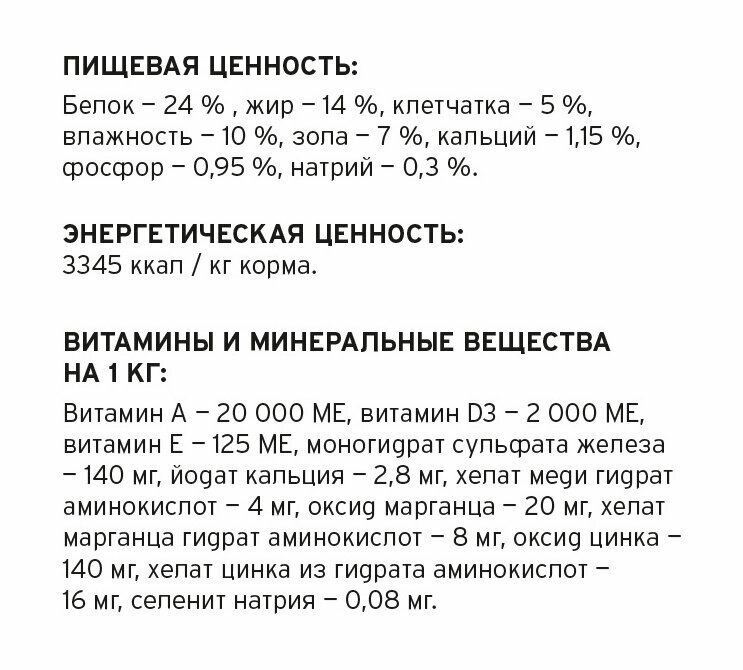 | Состав | СОСТАВ: мука из мяса курицы, горох, овес, лущеный ячмень, мясо курицы без костей, сушеная мякоть свеклы, высушенная на солнце люцерна, куриный жир, сохраненный при помощи токоферолов , натуральный ароматизатор, монокальцийфосфат, лецитин, соль, масло сельди менхаден, хлорид холина, карбонат кальция, сульфат железа, ацетат альфатокоферола (источник витамина Е), оксид цинка, капуста кале, сушеные водоросли, сушеный шпинат, сушеная брокколи, тимьян, шалфей, экстракт зеленого чая, мята, сушеная петрушка, экстракт розмарина, имбирь, корица, витамины и минералы. Гарантированный анализ: протеин 25% , жир 10%, клетчатка 5% , влажность 10%, зола 7 %, кальций 1.2 %, фосфор 1%, натрий 0.3%, Vitamin A 20,000 МЕ/кг, Vitamin D3 2000 МЕ/кг, Vitamin E 125 МЕ/кг. Энергия метаболизма 3345 ккал\кг |