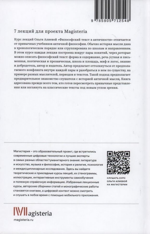 Обращение к античным философским источникам требует от читателя не только погружения в философскую проблематику, но и понимания, по каким жанровым законам создан текст. Хотя традиционно эти вопросы относят к ведению историков литературы, на практике провести различие между "формой" и "содержанием" невозможно, так как именно жанр задает направление интерпретации. Но само понятие жанра достаточно противоречивое, и в лекциях, собранных в этой книге, О.В. Алиева переосмысляет многие из привычных оппозиций, с которыми мы подходим к античным источникам (поэзия и проза, миф и логос и др.), показывая на конкретных примерах, как выбор формы изложения может быть связан с философией. Отдельная лекция посвящена созданию и редактуре текстов в античности, а также организации корпусов и канонов. Книга адресована всем, кто приступает к изучению античной философии и не имеет специальной подготовки в области классической филологии.