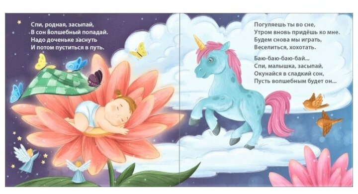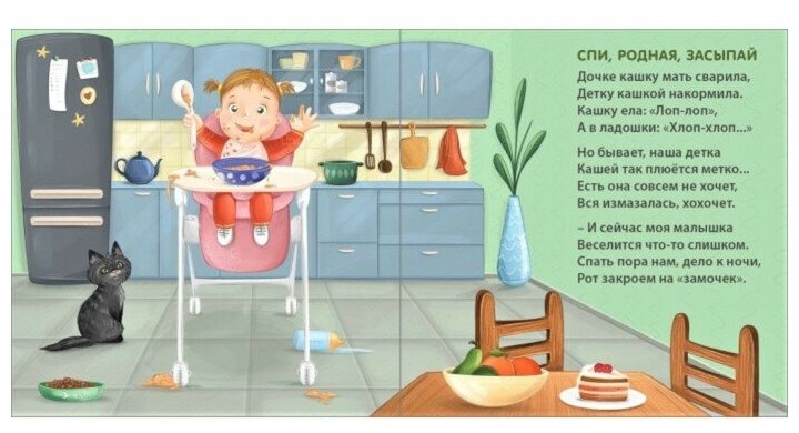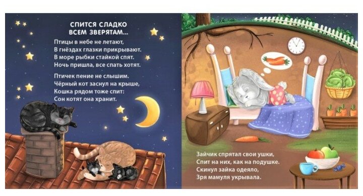 Замечательная книжечка для чтения в течение дня, на каждом развороте милые иллюстрации, описывая которые, можно создать сонные сюжеты (зайчику снится морковка/зайчик спит под одеялом; мама поёт малышу колыбельную/кто поёт тебе колыбельную перед сном?) и использовать вечером при укладывании.