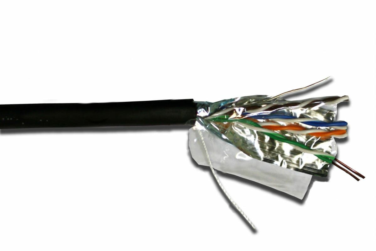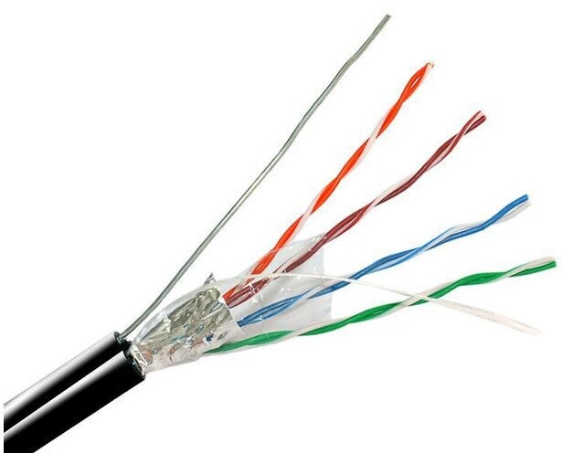 Кабель витая пара фирмы Lanmaster LAN-5EFTP-OUT состоит из 4-х пар одножильных медных проводников. Каждый проводник заключен в изоляцию HDPE. Два проводника, скрученных со специально подобранным шагом, составляют одну витую пару. 4 витых пары обернуты полиэтиленовой пленкой и вместе с медным заземляющим проводником заключены в общий экран из фольги и оболочку из PE. Высокопроизводительный экранированный кабель для передачи цифровой и аналоговой информации на частотах до 200 МГц. Цветовая кодировка: пара 1 «голубой/бело-голубой»; пара 2 «оранжевый/бело-оранжевый»; пара 3 «зеленый/бело-зеленый»; пара 4 «коричневый/бело-коричневый».