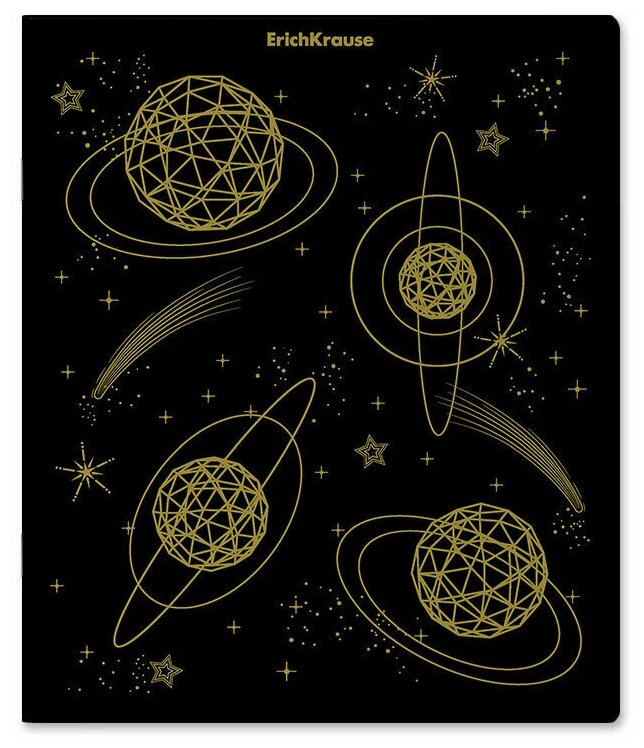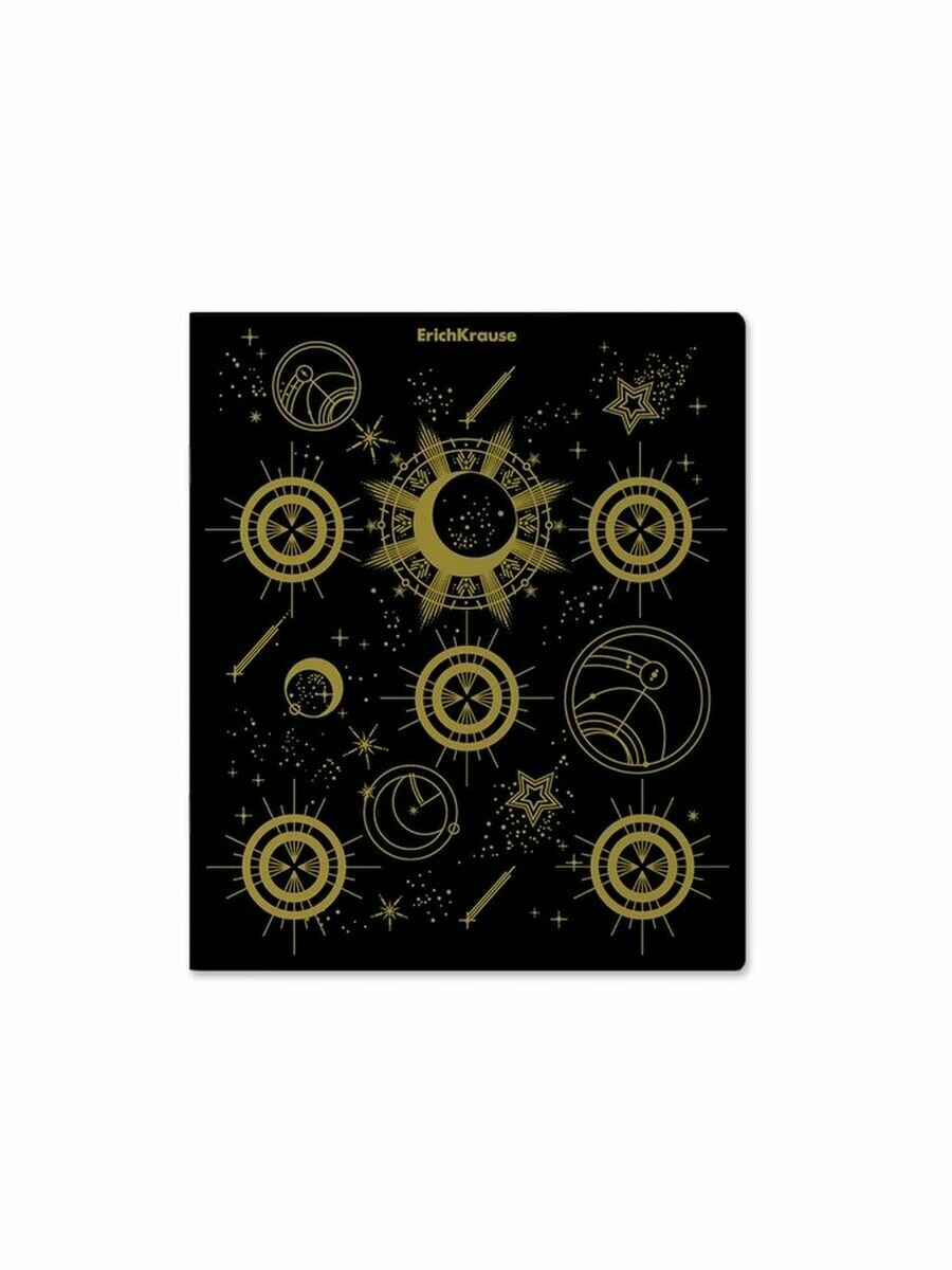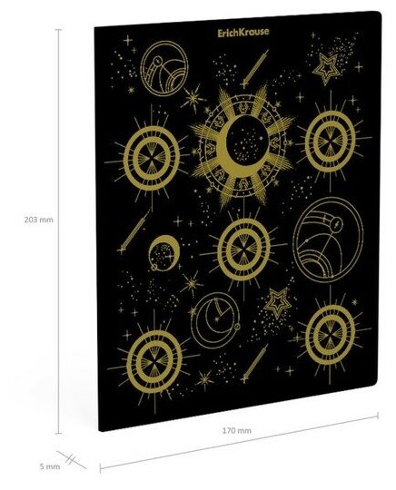 Тетрадь ученическая 48 листов в клетку ErichKrause Magic Sky, индивидуальный дизайн, обложка картон, с тиснением. Тетрадь общая формата А5+ (170 х 203 мм). Особенности: Обложка из высококачественного крашенного в массе черного картона плотностью 180 г/м2. Отделка обложки - тиснение золотой фольгой. В блоке 48 листов в клетку с полями. Бумага офсетная плотностью 60 г/м2. Белизна бумаги - 100%. Цвет линовки - синий. Скругленные уголки обложки и блока. Тип скрепления - скоба. Тетради упакованы в термоусадочную плёнку по 5 штук.(7896147)