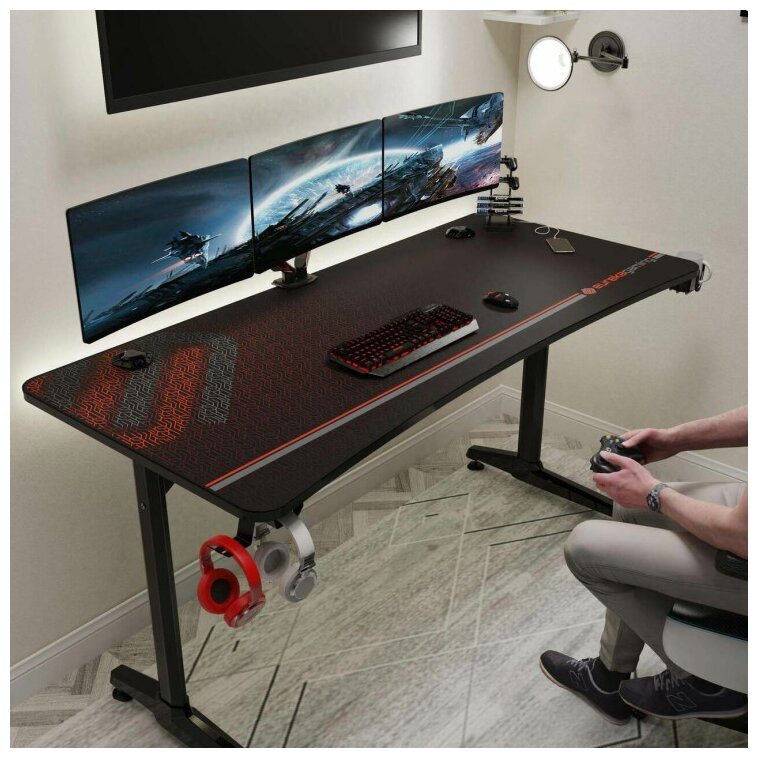 Современный, эргономичный компьютерный стол. Столешница с гладким покрытием в стиле карбон обладает отверстиями для укладки кабелей - на вашем столе никогда не будет лишних проводов. Высокая прочность каркаса позволяет столу выдерживать нагрузку до 81 кг. Возможность регулировки ножек по высоте (до 1 см) для безупречно ровной установки стола в случаях, когда поверхность не обладает идеальным горизонтом. Металлические "распорки" повышают устойчивость, чтобы Вы не "колебались" во время игрового процесса, ведь важна каждая секунда. Набор аксессуаров (держатель наушников, геймпада, подстаканник и прочее), чтобы игровая зона соответствовала требованиям пользователя. Стол легкий в сборке, перемещении, эксплуатации.