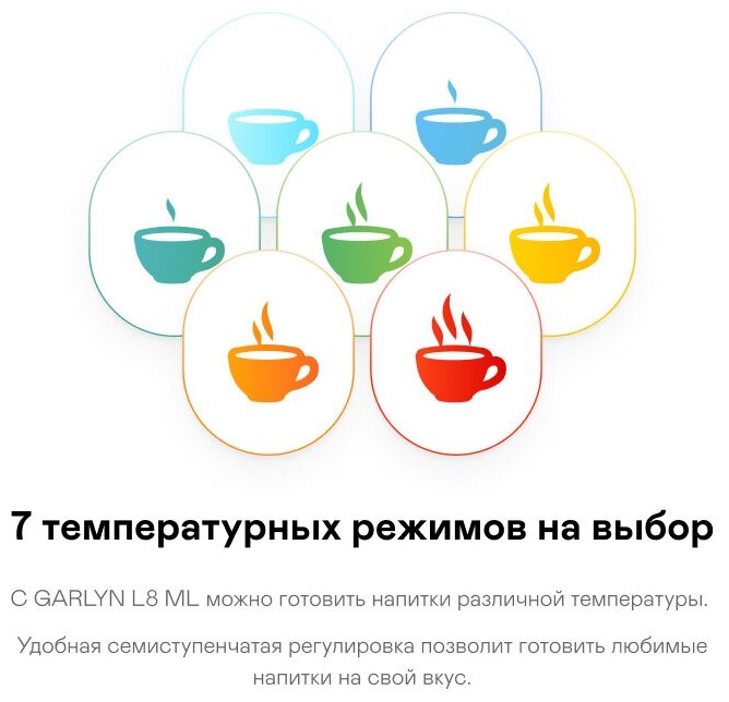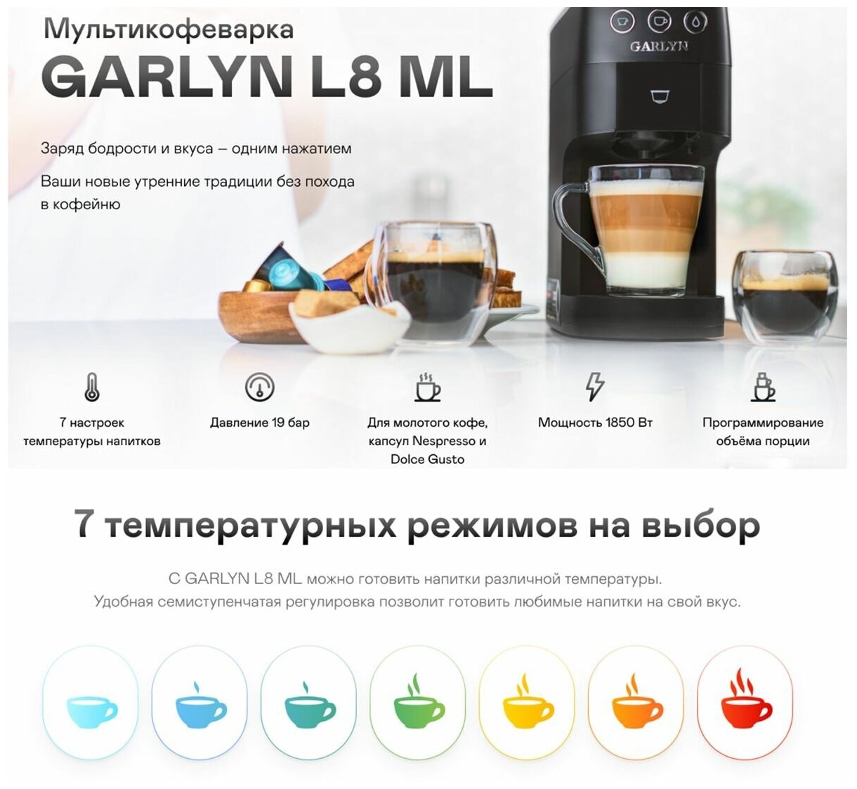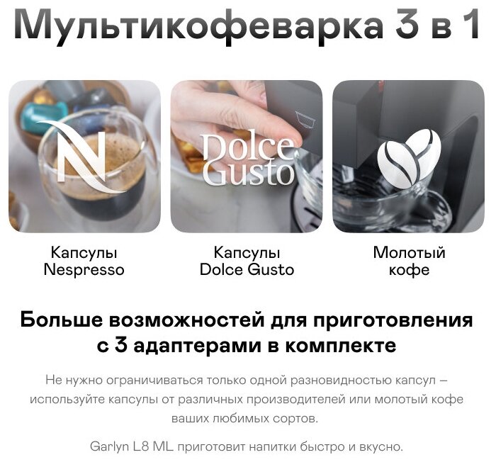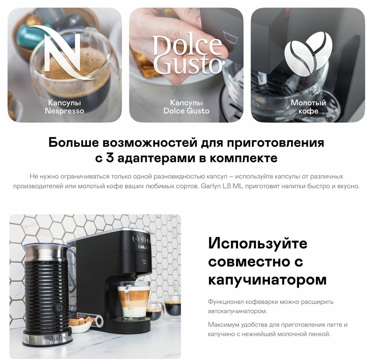 Больше возможностей для приготовления с 3 адаптерами в комплекте: используйте капсулы Nespresso, Dolce Gusto или молотый кофе Garlyn L8 ML приготовит ваши любимые напитки быстро и вкусно.