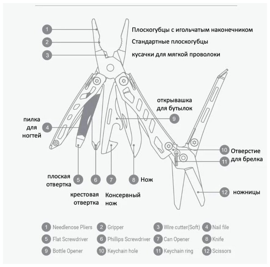 | Тип инструмента | Напильник, Нож, Ножницы, Острогубцы, Отвертка, Открывашка, Плоскогубцы |