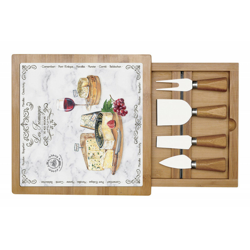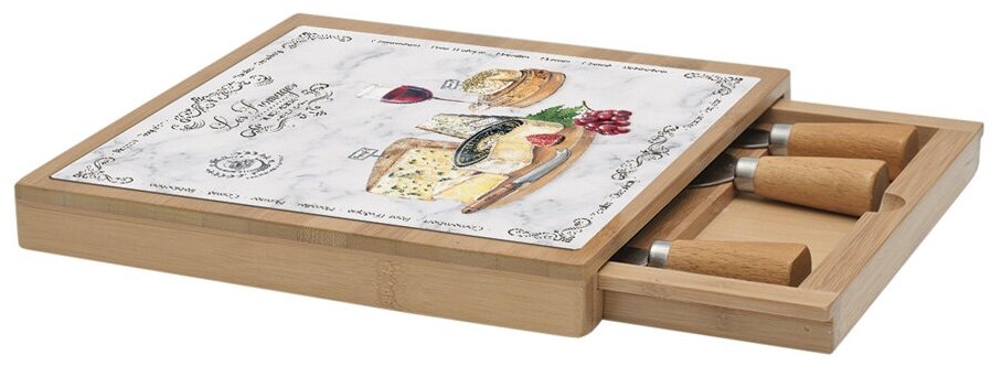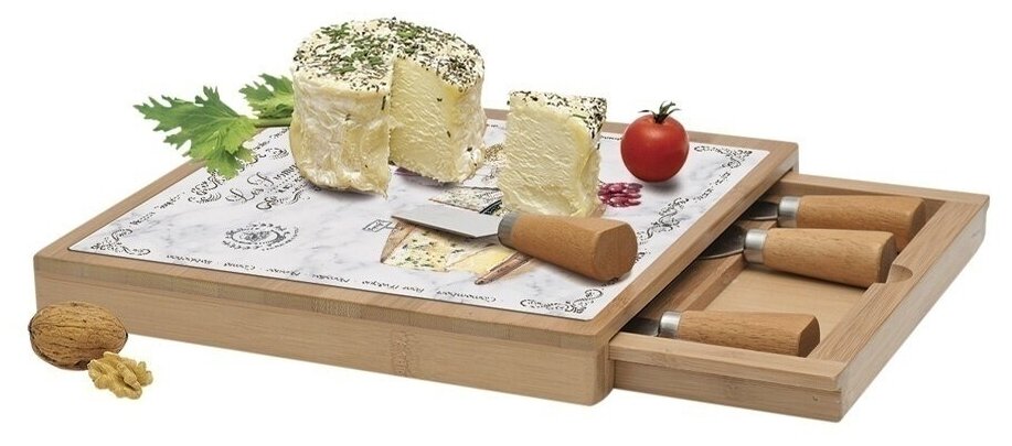 Набор для сыра состоит из доски с выдвижным ящиком, 4 ножей для сыра. Набор изготовлен из стекла, натурального бамбука и нержавеющей стали. Ножи для сыра имеют эргономичные деревянные ручки. Продуманная комплектация для нарезки любых сыров, независимо от их твердости. Доска для нарезки одновременно служит и подносом для подачи сыров и держателем для ножей. Рекомендуется мыть вручную теплой водой с применением жидких моющих средств.