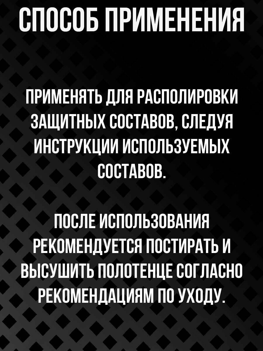 Применять для располировки защитных составов, следуя инструкции используемых составов. После использования рекомендуется постирать и высушить полотенце согласно рекомендациям по уходу.