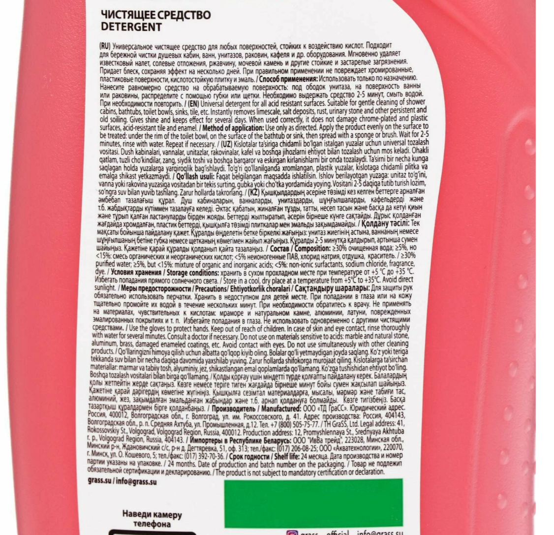 ≥30% очищенная вода; ≥5%, но <15%: смесь органических и неорганических кислот; <5% неионогенные ПАВ, хлорид натрия, отдушка, краситель.