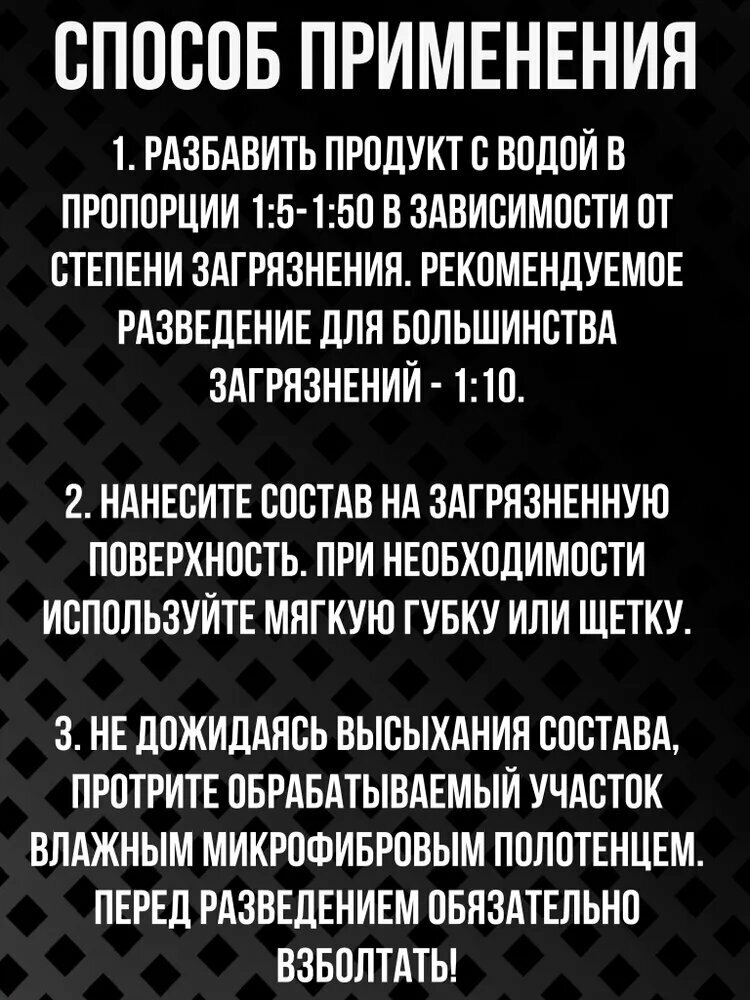 1. Разбавить продукт с водой в пропорции 1:5-1:50 в зависимости от степени загрязнения. Рекомендуемое разведение для большинства загрязнений - 1:10. 2. Нанесите состав на загрязненную поверхность. При необходимости используйте мягкую губку или щетку. 3. Не дожидаясь высыхания состава, протрите обрабатываемый участок влажным микрофибровым полотенцем. Перед разведением обязательно взболтать!