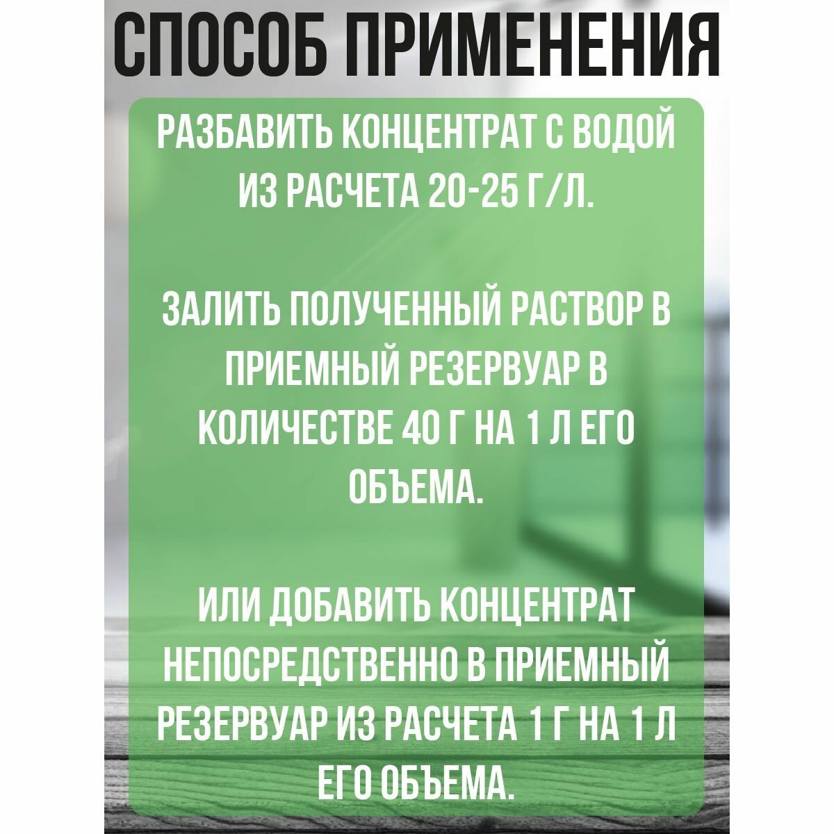 разбавить концентрат с водой из расчета 20-25 г/л. Залить полученный раствор в приемный резервуар в количестве 40 г на 1 л его объема. Или добавить концентрат непосредственно в приемный резервуар из расчета 1 г на 1 л его объема.