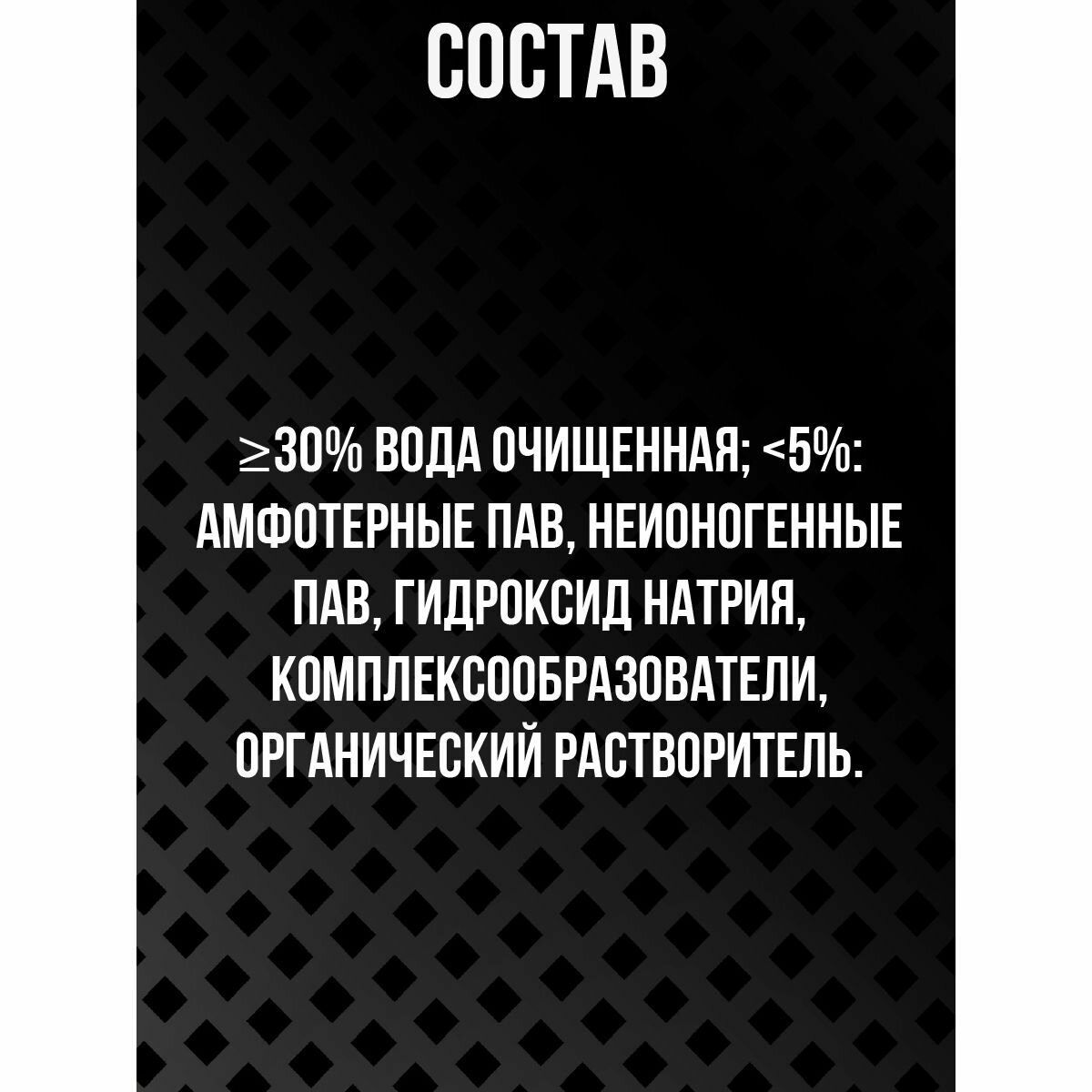≥30% вода очищенная; <5%: амфотерные ПАВ, неионогенные ПАВ, гидроксид натрия, комплексообразователи, органический растворитель.