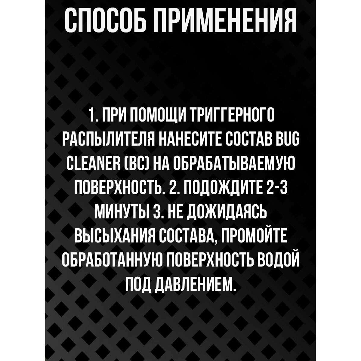 1. При помощи триггерного распылителя нанесите состав Bug Cleaner (BC) на обрабатываемую поверхность. 2. Подождите 2-3 минуты 3. Не дожидаясь высыхания состава, промойте обработанную поверхность водой под давлением.