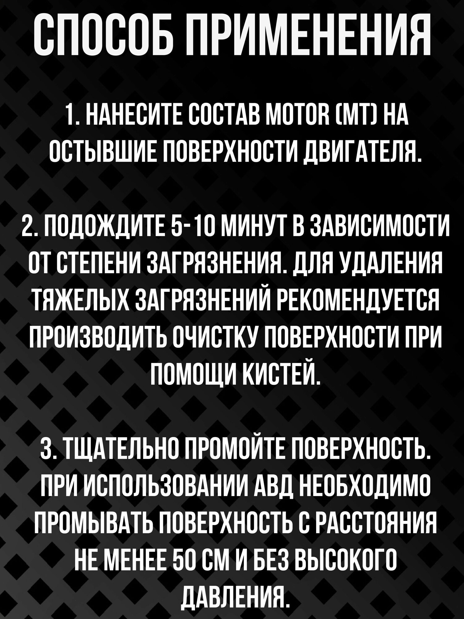1. Нанесите состав Motor (MT) на остывшие поверхности двигателя. 2. Подождите 5-10 минут в зависимости от степени загрязнения. Для удаления тяжелых загрязнений рекомендуется производить очистку поверхности при помощи кистей. 3. Тщательно промойте поверхность. При использовании АВД необходимо промывать поверхность с расстояния не менее 50 см и без высокого давления.
