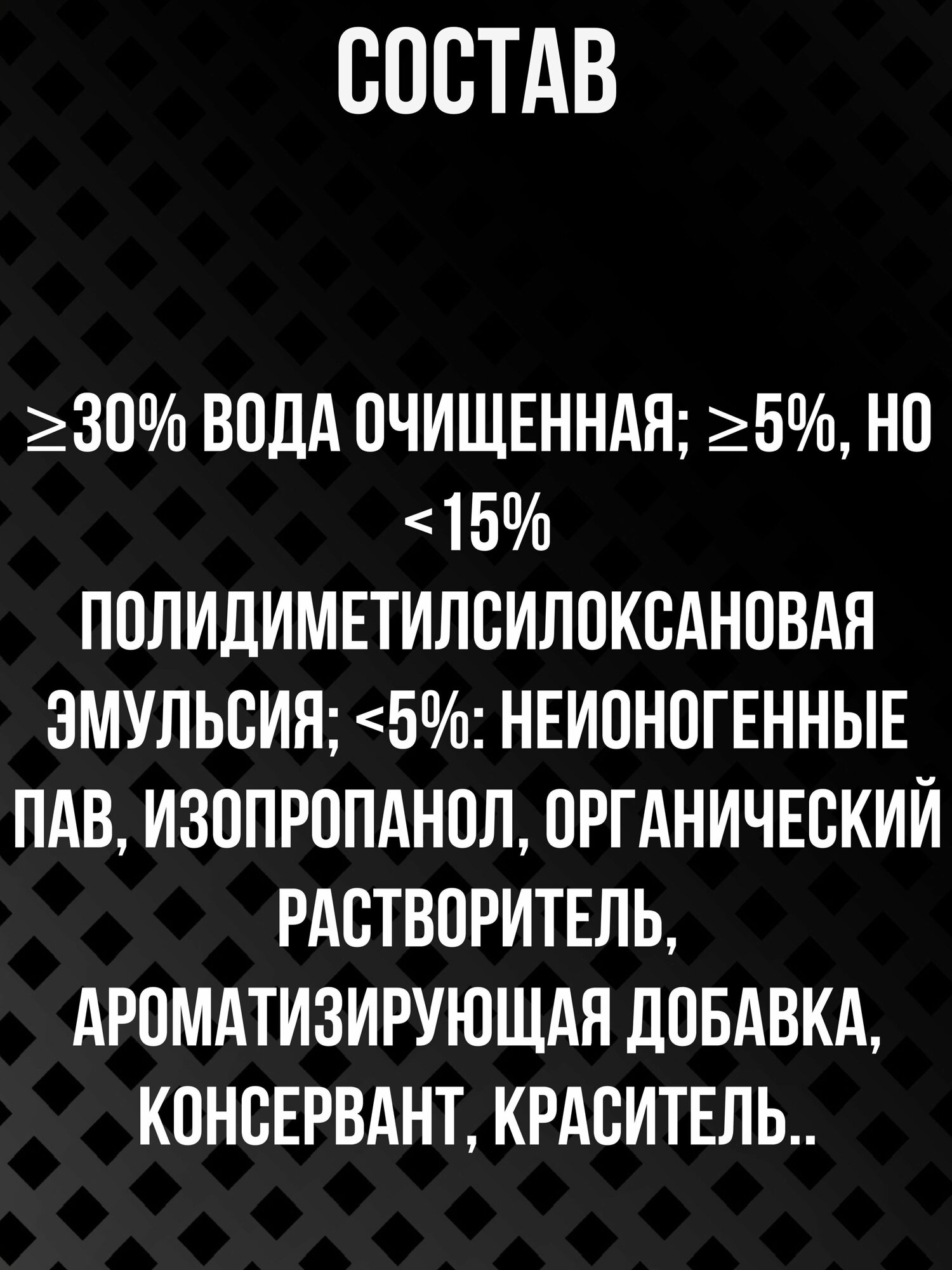 ≥30% вода очищенная; ≥5%, но <15% полидиметилсилоксановая эмульсия; <5%: неионогенные ПАВ, изопропанол, органический растворитель, ароматизирующая добавка, консервант, краситель.