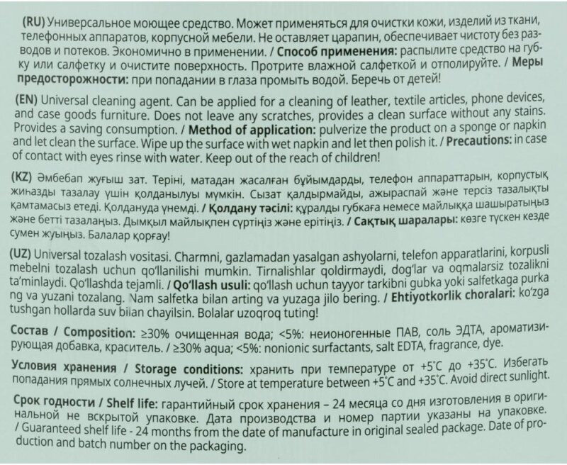 Универсальное моющее средство. Может применяться для очистки кожи, изделий из ткани, телефонных аппаратов, корпусной мебели. Не оставляет царапин, обеспечивает чистоту без разводов и потеков. Экономично в применении.