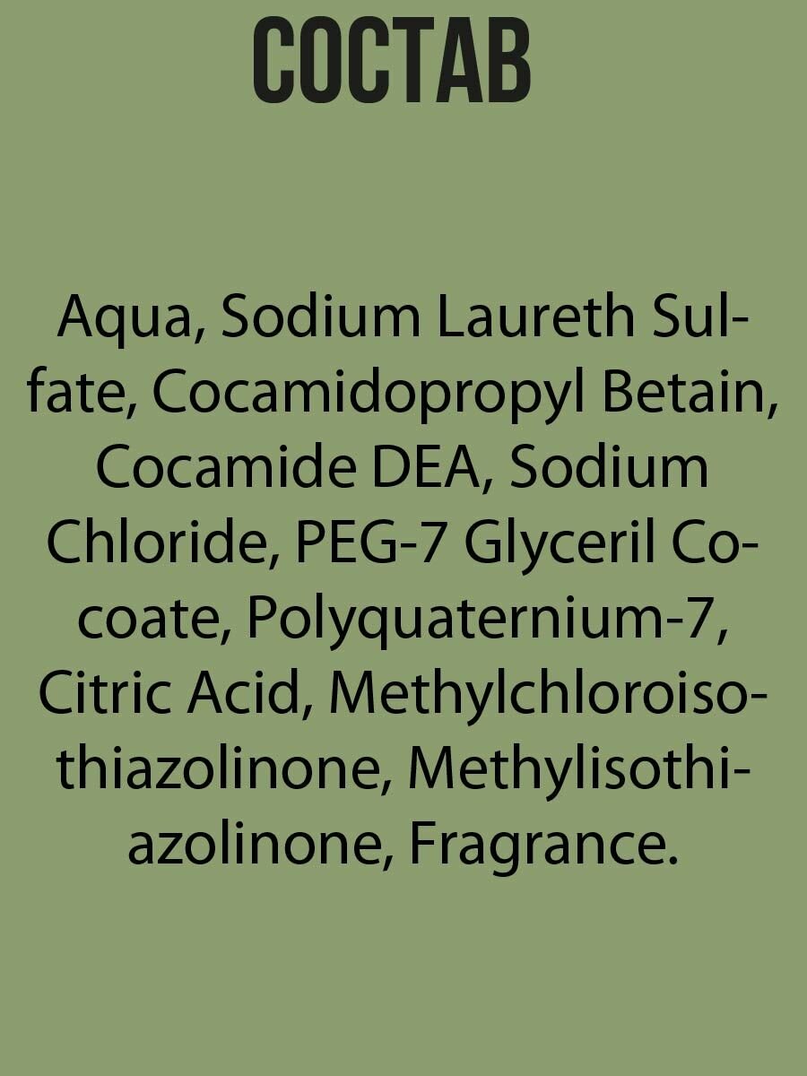 Aqua, Sodium Laureth Sulfate, Cocamidopropyl Betain, Cocamide DEA, Sodium Chloride, PEG-7 Glyceril Cocoate, Polyquaternium-7, Citric Acid, Methylchloroisothiazolinone, Methylisothiazolinone, Fragrance.