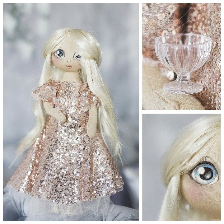Интерьерная кукла 'Николь'.Очень нежная и утонченная девочка, любит праздники и вечеринки, обожает петь и веселиться. Привыкла быть в центре внимания, она чувствует себя принцессой, поэтому в будущем мечтает встретить настоящего принца!Николь-куколка праздник, все ее платье расшито пайетками, для того, чтобы платье было более пышным-добавлена нижняя фатиновая юбочка. Очаровательные ботиночки так же изготовлены из материала с блестками. Сделать кукле лицо не составит труда, в наборе есть термопереводка, которую при помощи утюга нужно перенести на готовую куклу.Данный набор станет отличным подарком для тех, кто любит выделятся и блистать, всегда быть в центре внимания!.В состав набора входит подробная пошаговая инструкция, выкройка куклы в натуральную величину, трикотаж для пошива тела куклы, лоскуты ткани для пошива одежды,искусственная кожа для изготовления обуви, волосы-трессы, термопереводка, декоративные элементы.Высота готовой куклы 30 см.