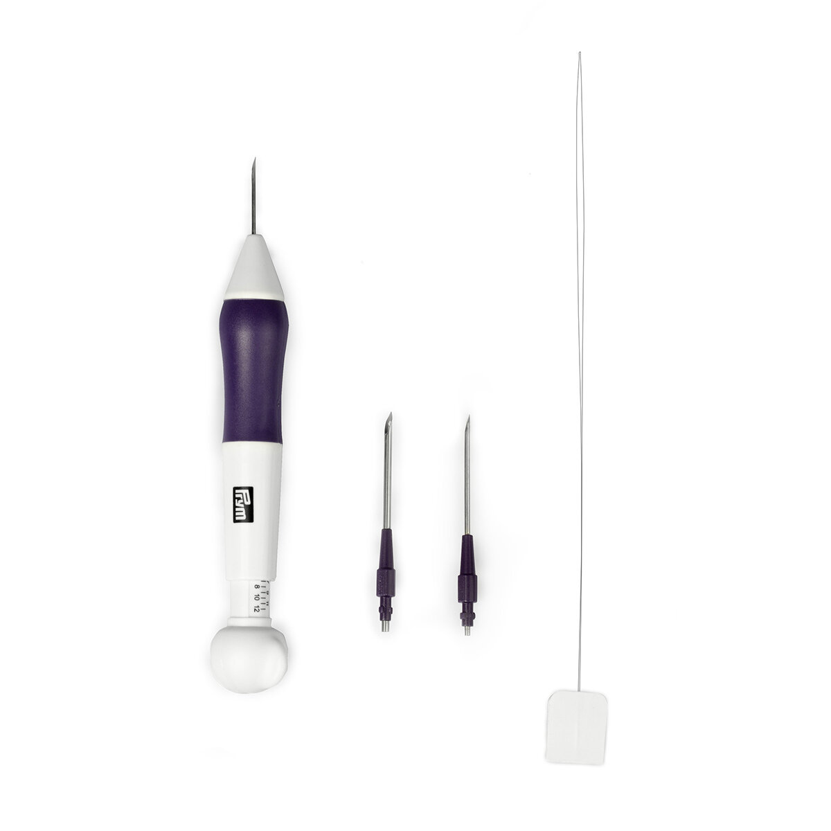 Иглы вставляются в ручку эргономичной формы. Специальный регулятор позволяет подобрать необходимую глубину стежка и длину петли.