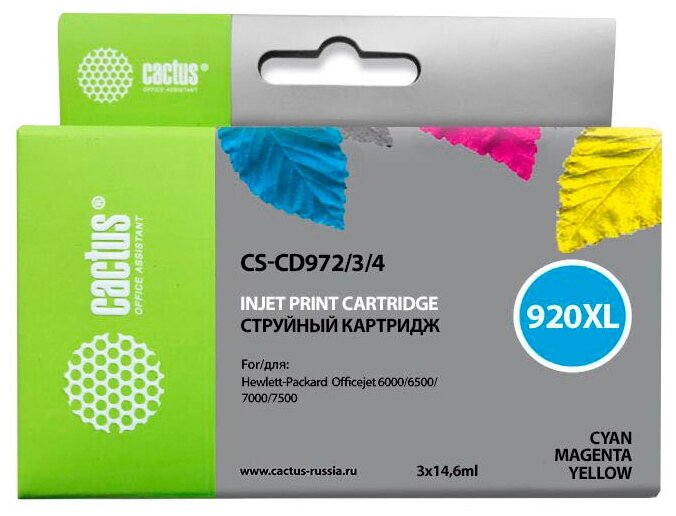Набор картриджей CACTUS №920XL голубой / желтый / пурпурный СS-CD972/3/4