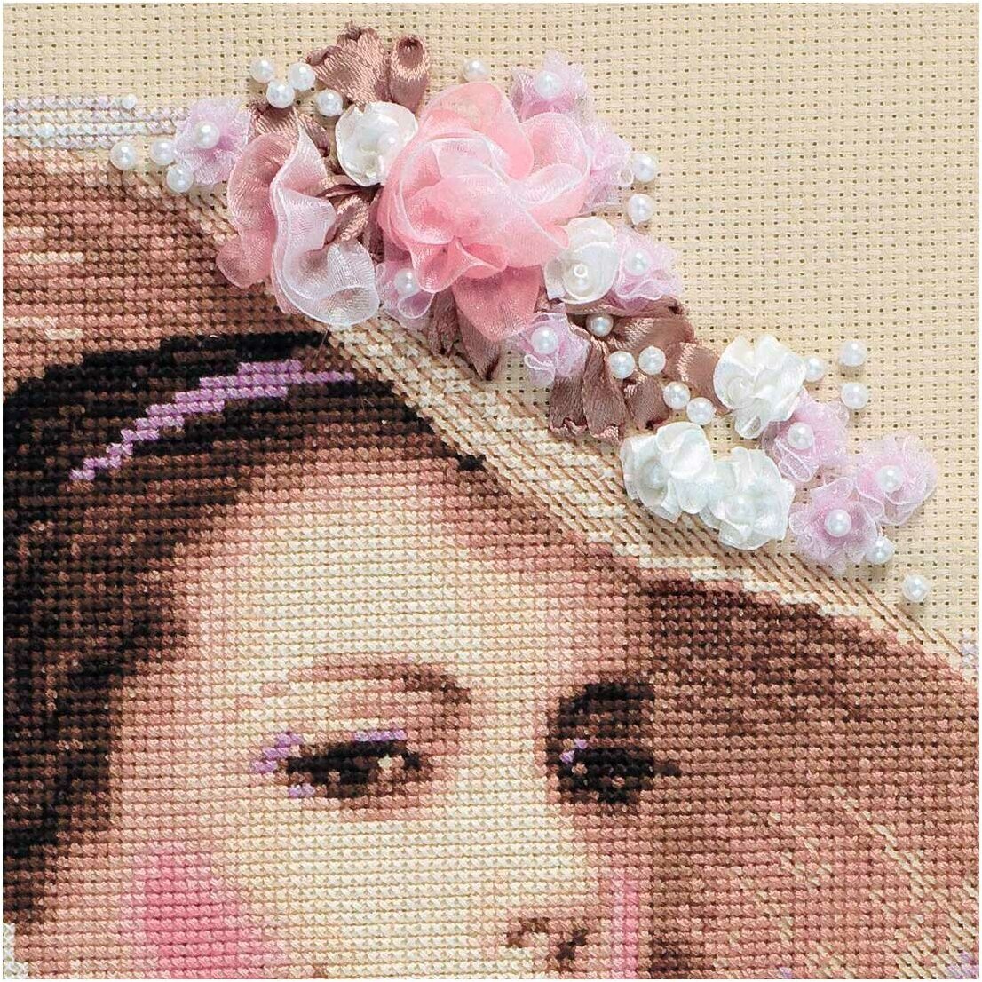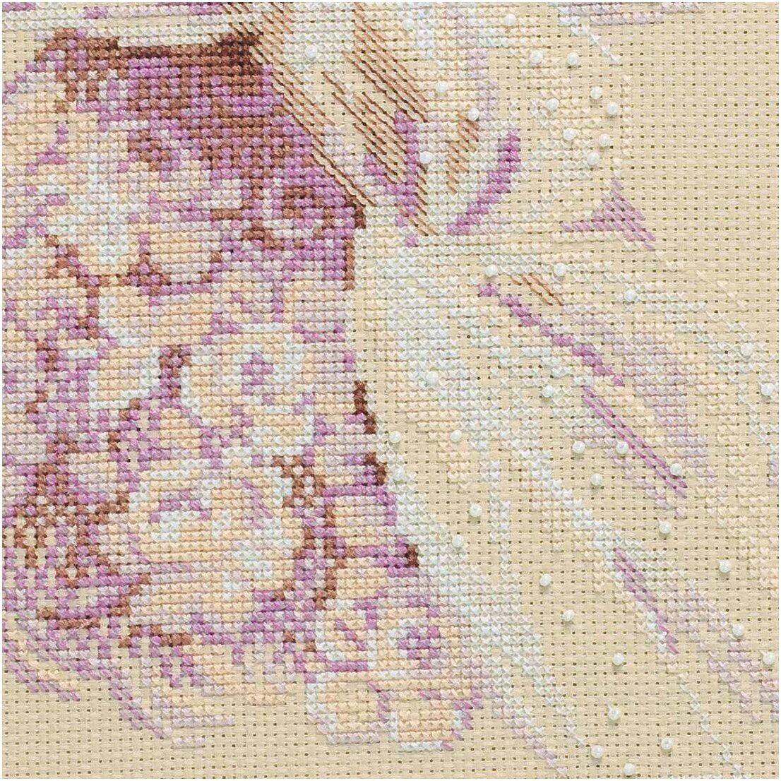 Канва Aida Zweigart 14 каунта прекрасно подходит для схем с подробной детализацией, но при этом позволяет выкладывать достаточно крупные стежки. При работе с такой канвой, скорее всего, не потребуется увеличительное стекло. Для вышивания используется мулине Anchor – эти нитки яркие, равномерные по всей длине, без узелков и утолщений, что позволяет добиться аккуратных стежков. Отдельные фрагменты украшены лентами, бусинами и бисером – это придает вышивке объем.
