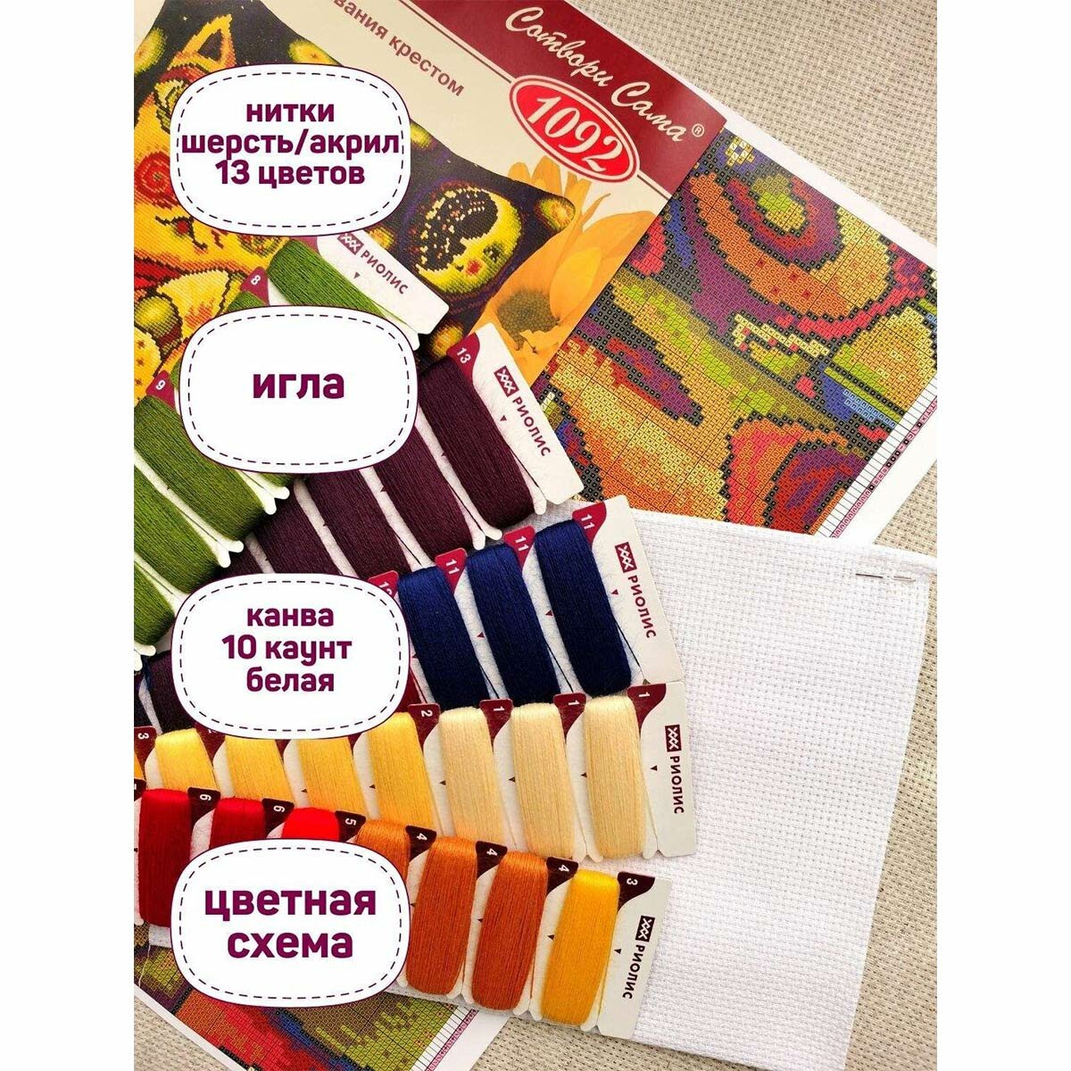 | Комплектация | канва Аида 10 Zweigart 100% хлопок; мулине шерсть 13 цветов; цветная схема; игла; инструкция по вышиванию |