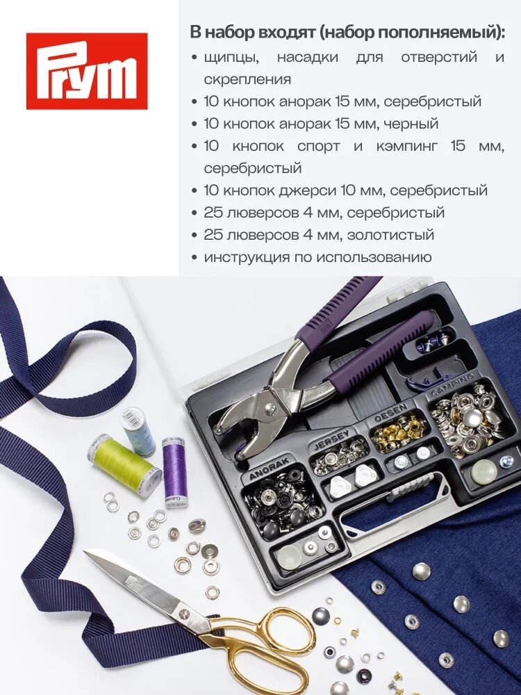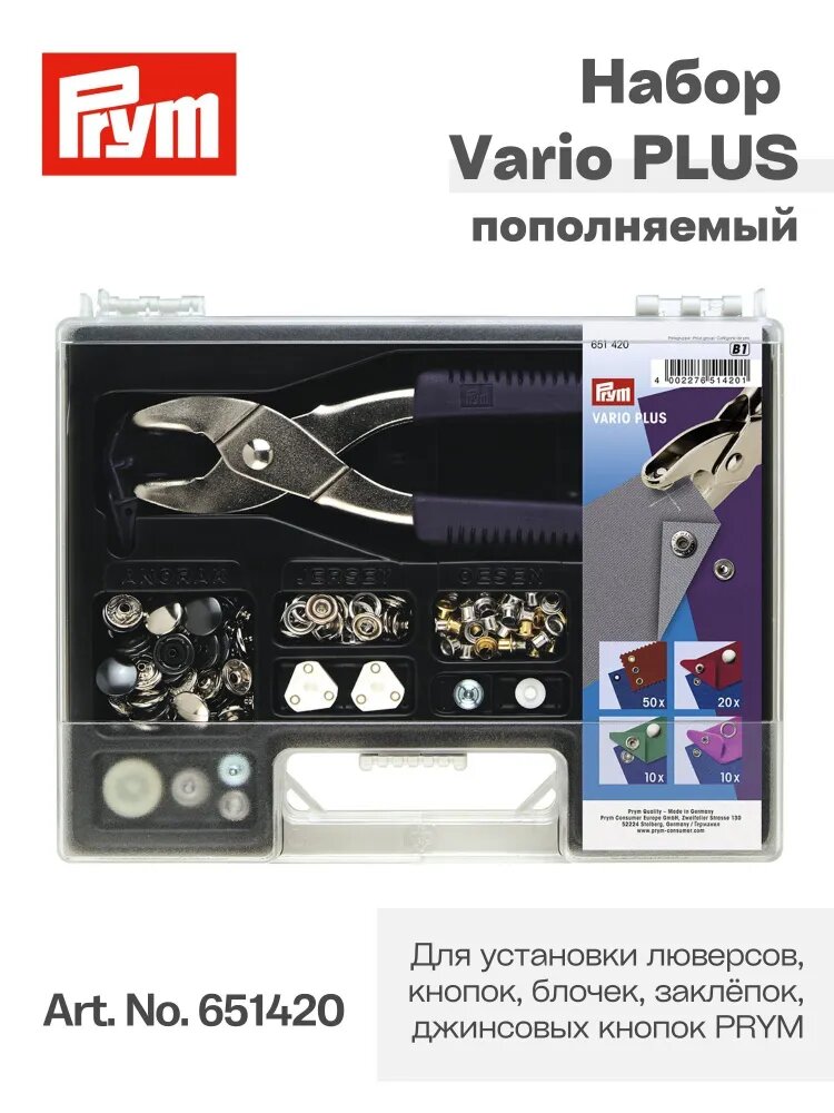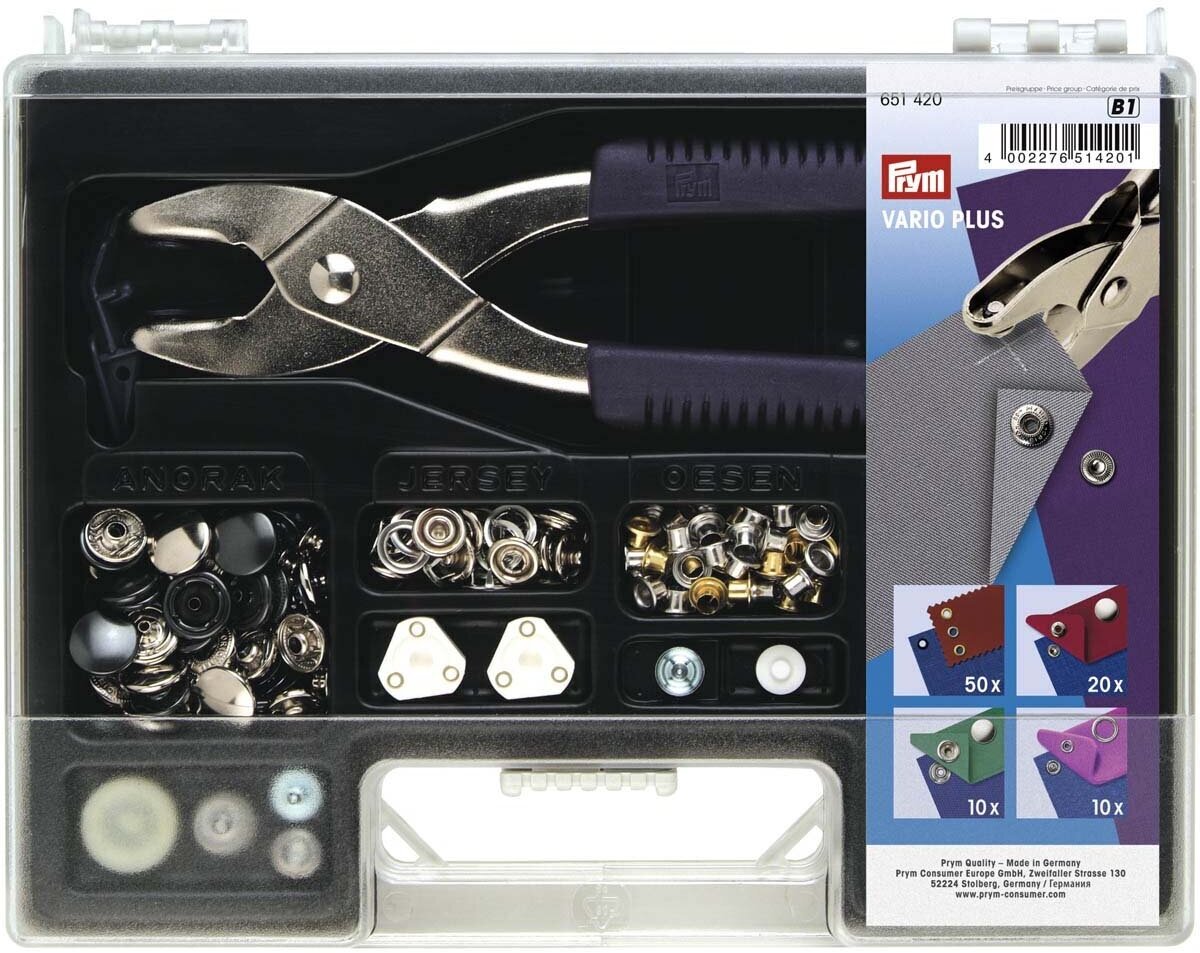 Набор Vario Plus позволяет устанавливать блочки, кнопки, люверсы. Упакован в удобный пластиковый контейнер с прозрачной крышкой. При необходимости ассортимент фурнитуры и насадок можно пополнить.