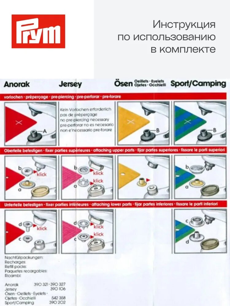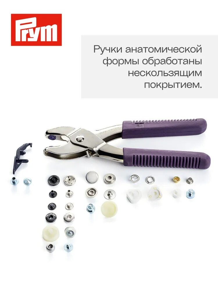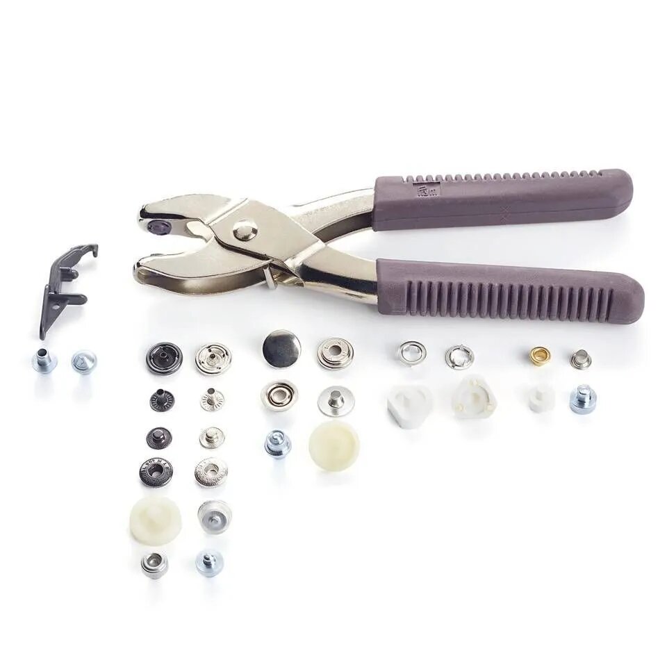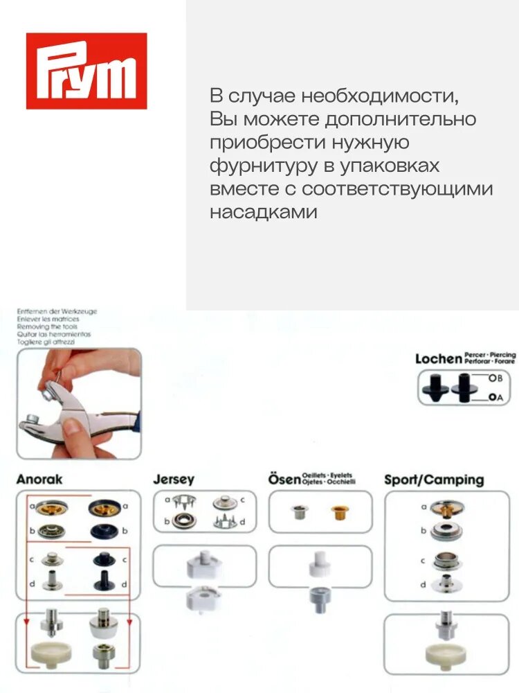 Инструменты: щипцы Prym Vario, насадка для пробивания отверстий диаметра 3 мм и 4 мм, насадки для установки фурнитуры (4 вида).