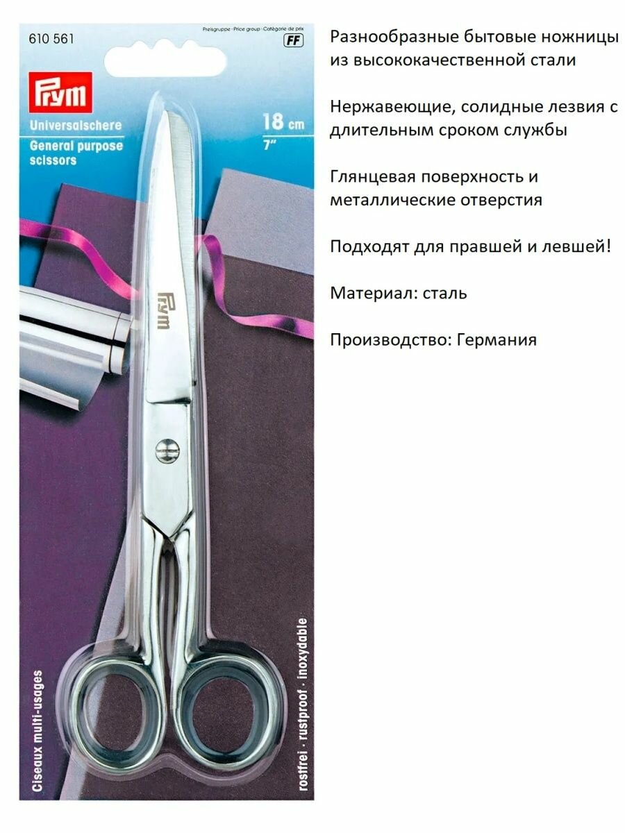 Цельнометаллические кованые стальные ножницы универсального назначения. Подходят для вырезания деталей кроя, детского творчества и других целей. Классическая симметричная форма, большой захват за счет величины лезвий.Изготовлены из закаленной высококачественной стали.Разработано немецкой компанией Prym, известным мировым лидером в производстве высококачественных принадлежностей для шитья и рукоделия. Ежедневно используя продукцию Prym, Вы ощутите заботу компании о Вашем комфорте и удобстве. Шейте с удовольствием, радуйте модными шедеврами себя и своих близких!