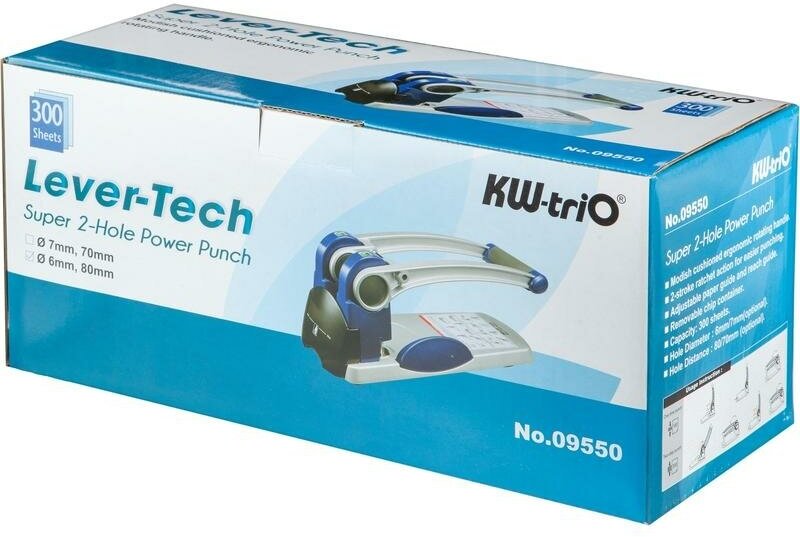 | Описание | Мощный дырокол KW-Trio 9550 пробивает одновременно до 300 листов благодаря механизму с использованием полых режущих элементов. Перфорирует два отверстия диаметром 6 мм, расстояние между отверстиями — 80 мм. В дыроколе предусмотрен отсек для конфетти и выдвижная линейка |