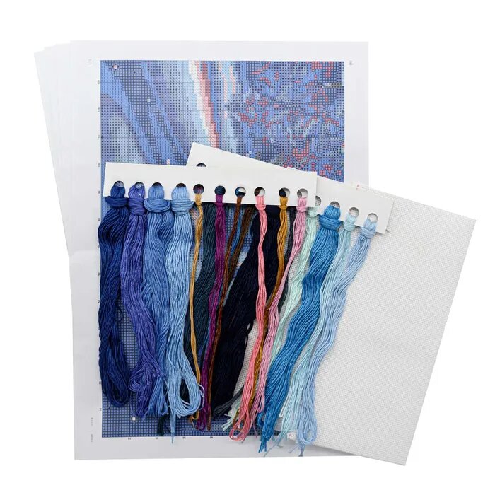 В наборе: канва без рисунка Aida 14, хлопковые мулине, игла, цветная схема, инструкция.